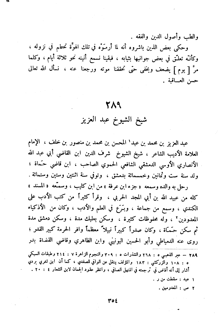 عبد العزيز بن محمد بن عبد (2) المحسن بن محمد بن منصور بن خلف، الإمام العلامة الأديب الشاعر، شيخ الشيوخ شرف الدين ابن القاضي أبي عبد الله الأنصاري الأوسي الدمشقي الشافعي الحموي الصاحب، ابن قاضي حماة؛ ولد سنة ست وثمانين وخمسمائة بدمشق، وتوفي سنة اثنتين وستين وستمائة. رحل به والده وسمعه جزء ابن عرفة من ابن كليب، وسمعه المسند كله من عبيد الله بن أبي المجد الحربي، وقرأ كثيراً من كتب الأدب على الكندي، وسمع من جماعة، وبرع في العلم والأدب، وكان من الأذكياء المعدودين (3) ، وله محفوظات كثيرة، وسكن بعلبك مدة، وسكن دمشق مدة ثم سكن حماة، وكان صدراً كبيراً نبيلاً معظماً وافر الحرمة كبير القدر؛ روى عنه الدمياطي وأبو الحسين اليونيني وابن الظاهري وقاضي القضاة بدر