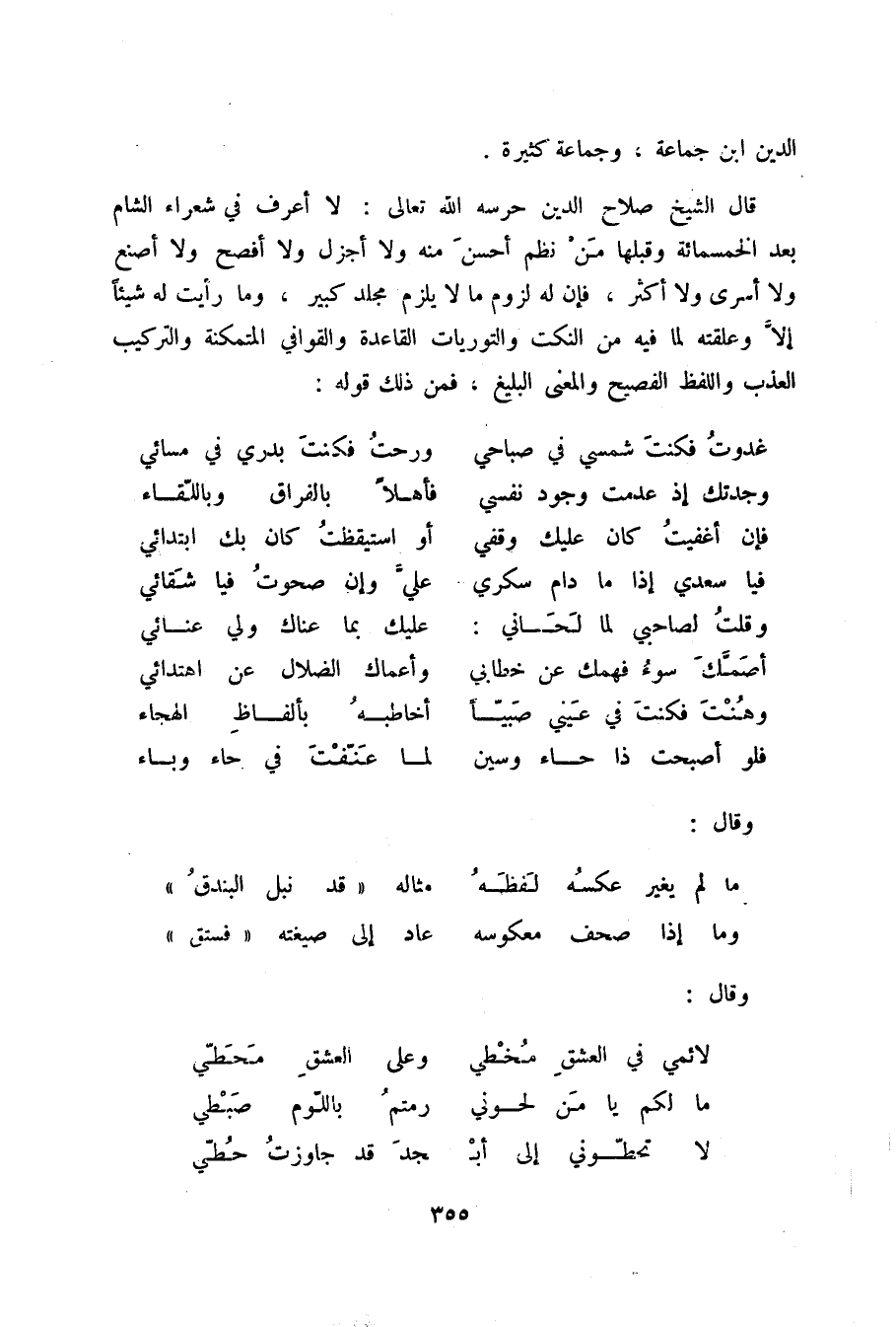 قال الشيخ صلاح الدين حرسه الله تعالى: لا أعرف في شعراء الشام بعد الخمسمائة وقبلها من نظم أحسن منه ولا أجزل ولا أفصح ولا أصنع ولا أسرى ولا أكثر، فإن له لزوم ما لا يلزم مجلد كبير، وما رأيت له شيئاً العذب واللفظ الفصيح والمعنى البليغ، فمن ذلك قوله: