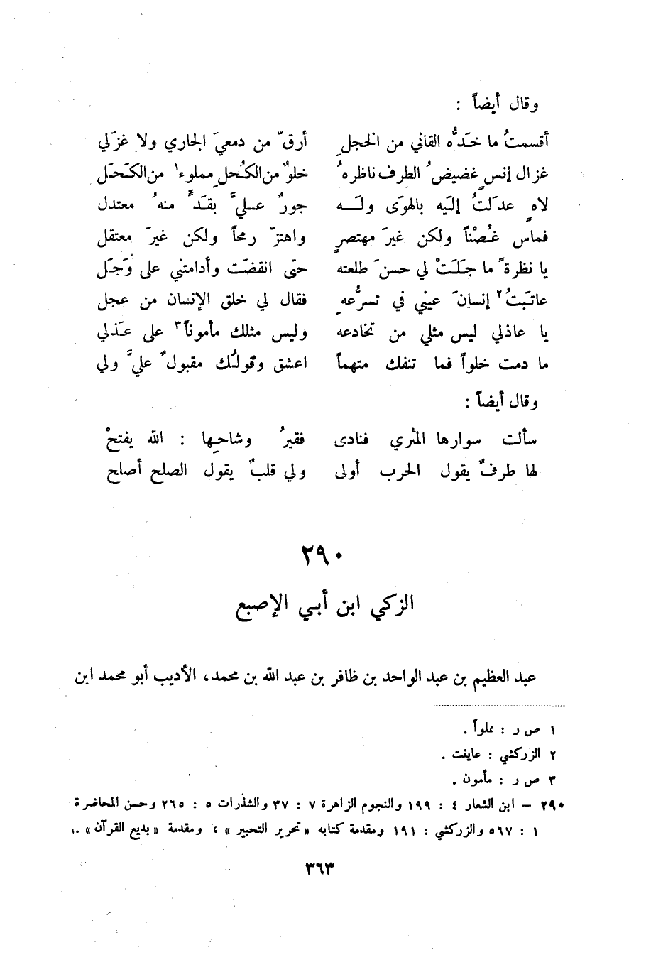 (4) ابن الشعار 4: 199 والنجوم الزاهرة 7: 37 والشذرات 5: 265 وحسن المحاضرة 1: 567 والزركشي: 191 ومقدمة كتابه ((تحرير التحبير)) ، ومقدمة ((بديع القرآن)) .