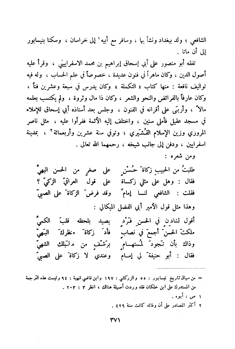 فقلت: الشافعي لنا إمام ... وقد فرض الزكاة على الصبي وهذا مثل قول الأمير أبي الفضل الميكالي: