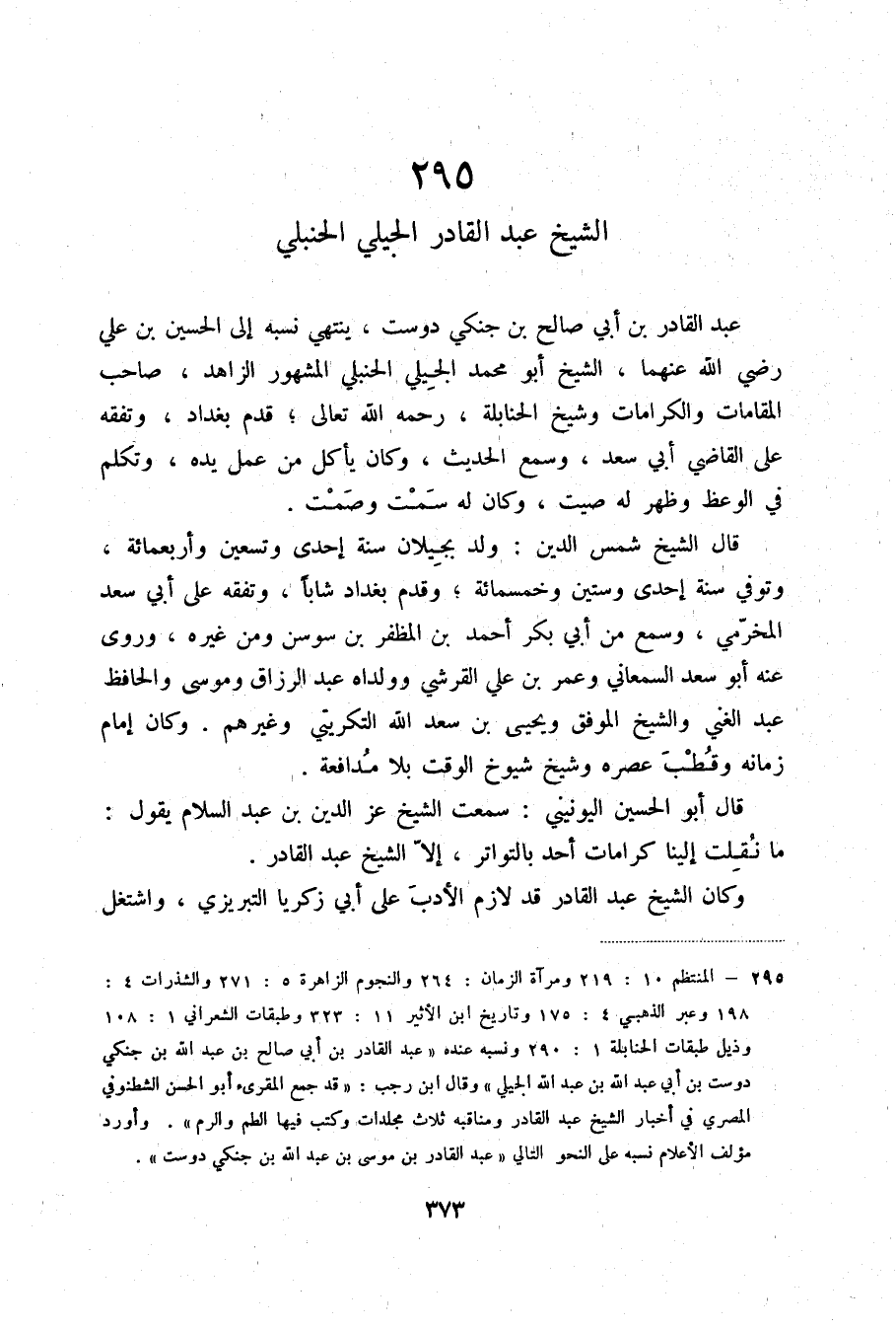 (1) المنظم 10: 219 ومرآة الزمان: 264 والنجوم الزاهرة 5: 271 والشذرات 4: 198 وعبر الذهبي 4: 175 وتاريخ ابن الأثير 11: 323 وطبقات الشعراني 1: 108 وذيل طبقات الحنابلة 1: 290 ونسبه عنده ((عبد القادر بن أبي صالح بن عبد الله بن جمكي دوست بن أبي عبد الله بن عبد الله الجيلي)) وقال ابن رجب: ((قد جمع المقرئ أبو الحسن الشطنوفي المصري في أخبار الشيخ عبد القادر ومناقبه ثلاث مجلدات وكتب فيها الطم والرم)) . وأورد مؤلف الأعلام نسبه على النحو التالي ((عبد القادر بن موسى بن عبد الله بن جنكي دوست)) .