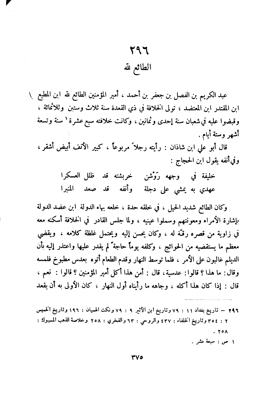 عبد الكريم بن الفضل بن جعفر بن أحمد، أمير المؤمنين الطائع لله ابن المطيع ابن المقتدر ابن المعتضد؛ تولى الخلافة في ذي القعدة سنة ثلاث وستين وثلاثمائة، وقبضوا عليه في شعبان سنة إحدى وثمانين، وكانت خلافته سبع عشرة (2) سنة وتسعة أشهر وستة أيام.