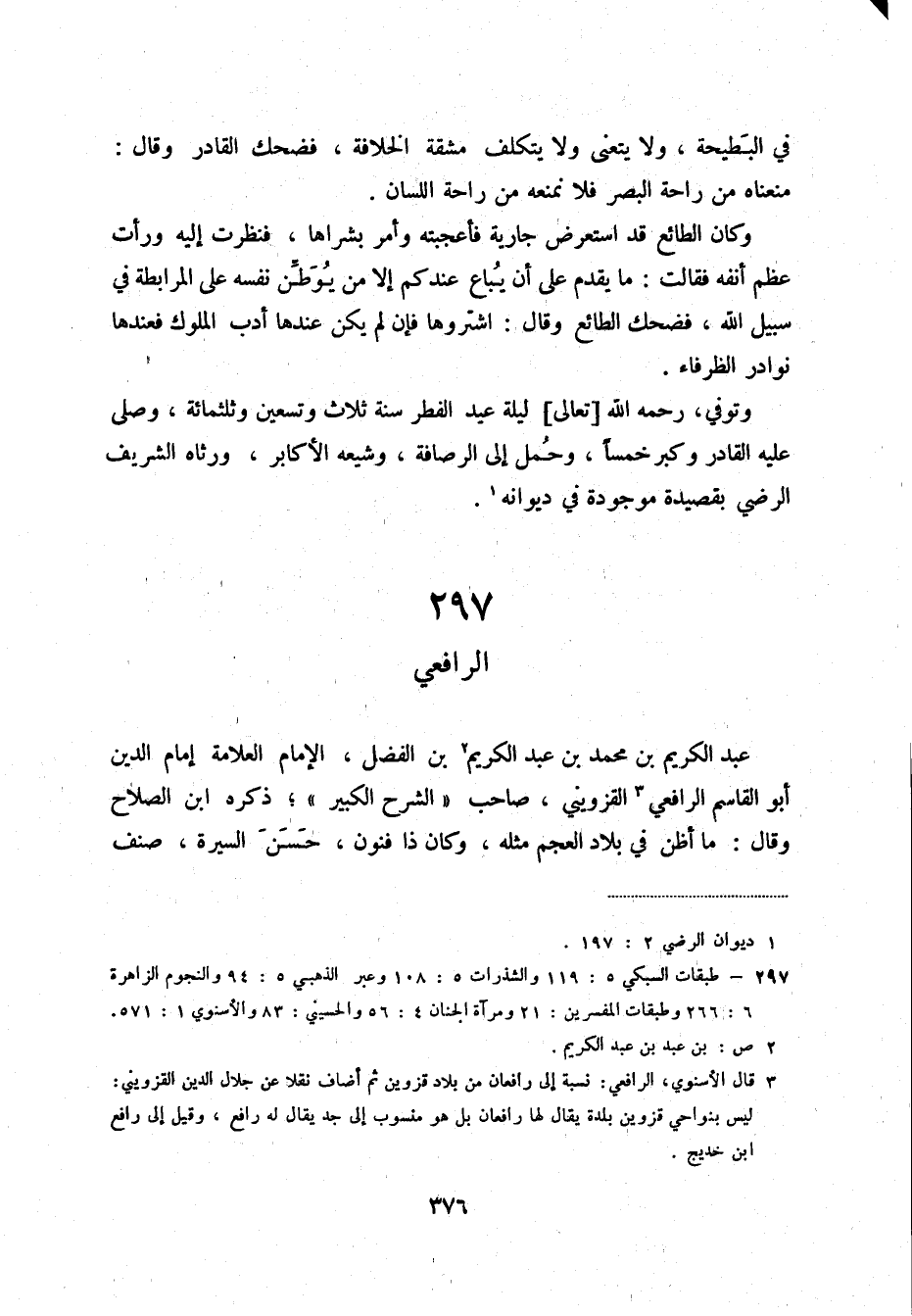 عبد الكريم بن محمد بن عبد الكريم (3) بن الفضل، الإمام العلامة إمام الدين أبو القاسم الرافعي (4) القزويني، صاحب الشرح الكبير؛ ذكره ابن الصلاح وقال: ما أظن في بلاد العجم مثله، وكان ذا فنون، حسن السيرة، صنف