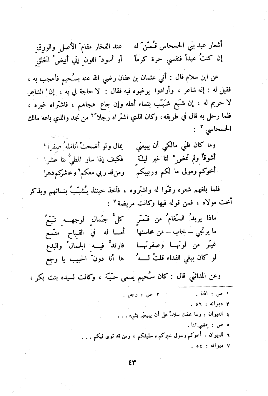 إن كنت عبداً فنفسي حرة كرماً ... أو أسود اللون إني أبيض الخلق عن ابن سلام قال: أتي عثمان بن عفان رضي الله عنه بسحيم فأعجب به، فقيل له: إنه شاعر، وأرادوا يرغبوه فيه فقال: لا حاجة لي به، إن (1) الشاعر لا حريم له، إن شبع شبب بنساء أهله وإن جاع هجاهم، فاشتراه غيره، فلما رحل به قال في طريقه، وكان الذي اشتراه رجلاً (2) من نجد والذي باعه مالك الحسحاسي (3) :