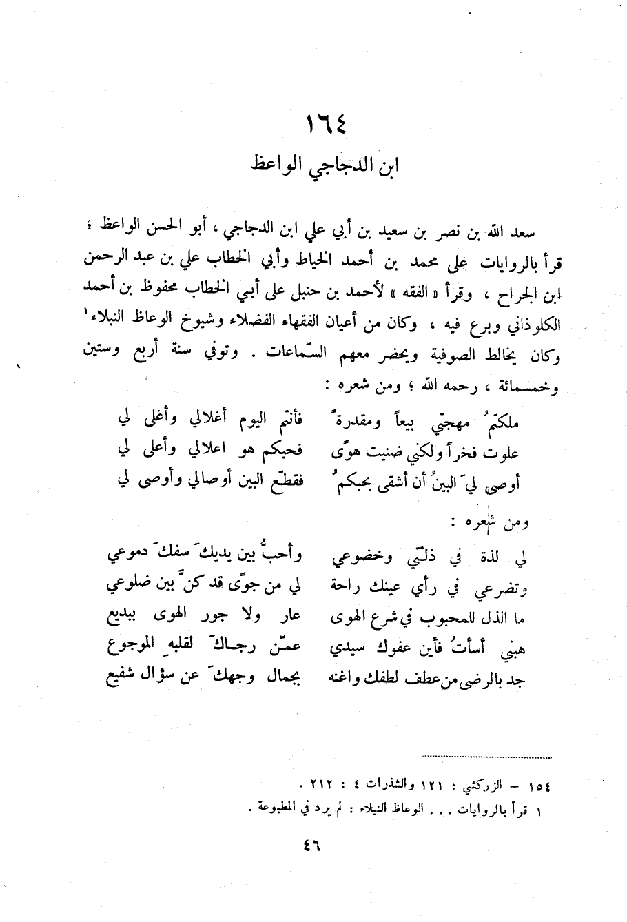 سعد الله بن نصر بن سعيد بن أبي علي ابن الدجاجي، أبو الحسن الواعظ؛ قرأ بالروايات على محمد بن أحمد الخياط وأبي الخطاب علي بن عبد الرحمن ابن الجراح، وقرأ الفقه لأحمد بن حنبل على أبي الخطاب محفوظ بن أحمد الكلوذاني وبرع فيه، وكان من أعيان الفقهاء الفضلاء وشيوخ الوعاظ النبلاء (2) وكان يخالط الصوفية ويحضر معهم السماعات. وتوفي سنة أربع وستين وخمسمائة، رحمه الله؛ ومن شعره: