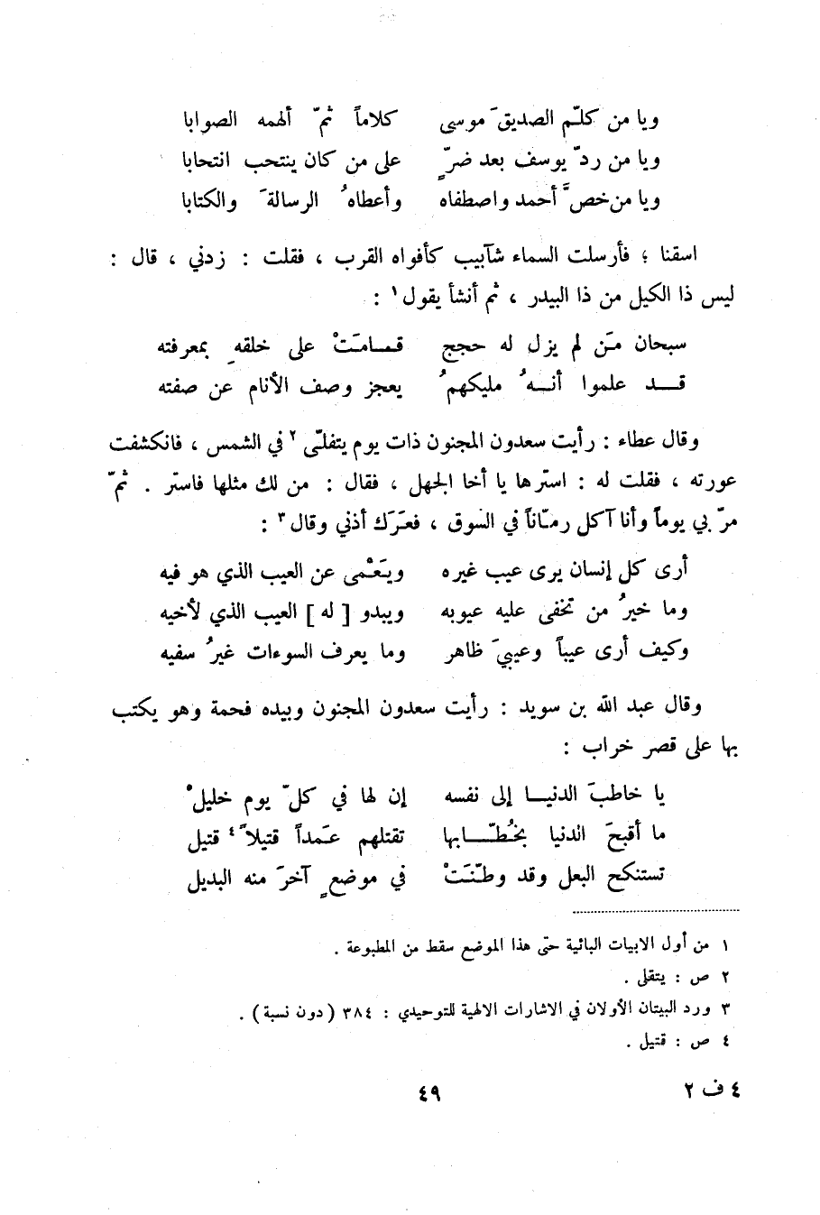 قد علموا أنه مليكهم ... يعجز وصف الأنام عن صفته وقال عطاء: رأيت سعدون المجنون ذات يوم يتفلى (2) في الشمس، فانكشفت عورته، فقلت له: استرها يا أخا الجهل، فقال: من لك مثلها فاستر. ثم مر بي يوماً وأنا آكل رماناً في السوق، فعرك أذني وقال (3) :