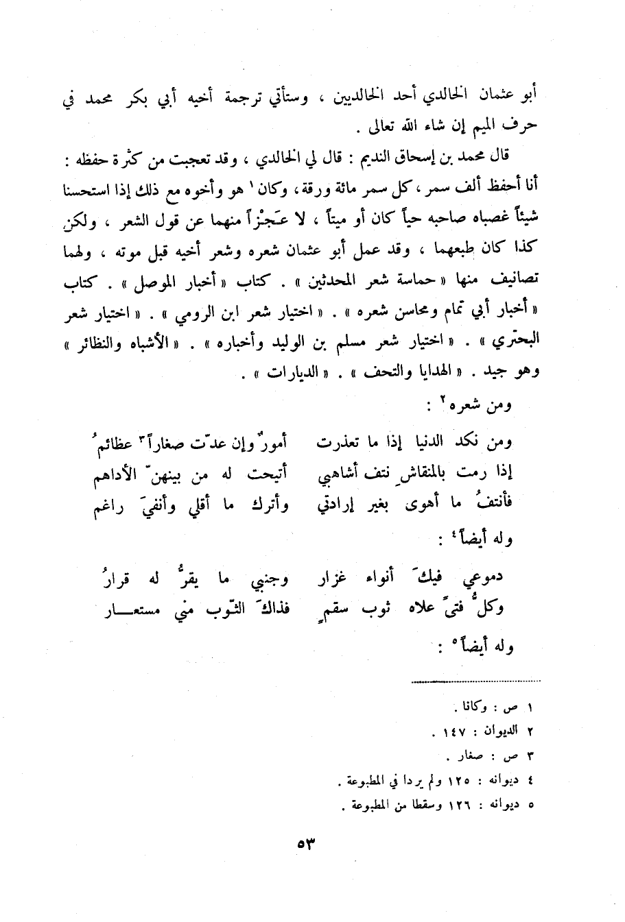 قال محمد بن إسحاق النديم: قال لي الخالدي، وقد تعجبت من كثرة حفظه: أنا أحفظ ألف سمر، كل سمر مائة ورقة، وكان (1) هو وأخوه مع ذلك إذا استحسنا شيئاً غصباه صاحبه حياً كان أو ميتاً، لا عجزاً منهما على قول الشعر، ولكن كذا كان طبعهما، وقد عمل أبو عثمان شعره وشعر أخيه قبل موته، ولهما تصانيف منها حماسة شعر المحدثين. كتاب أخبار الموصل. كتاب أخبار أبي تمام ومحاسن شعره. اختيار شعر ابن الرومي. اختيار شعر البحتري. اختيار شعر مسلم بن الوليد وأخباره. الأشباه والنظائر وهو جيد. الهدايا والتحف. الديارات.