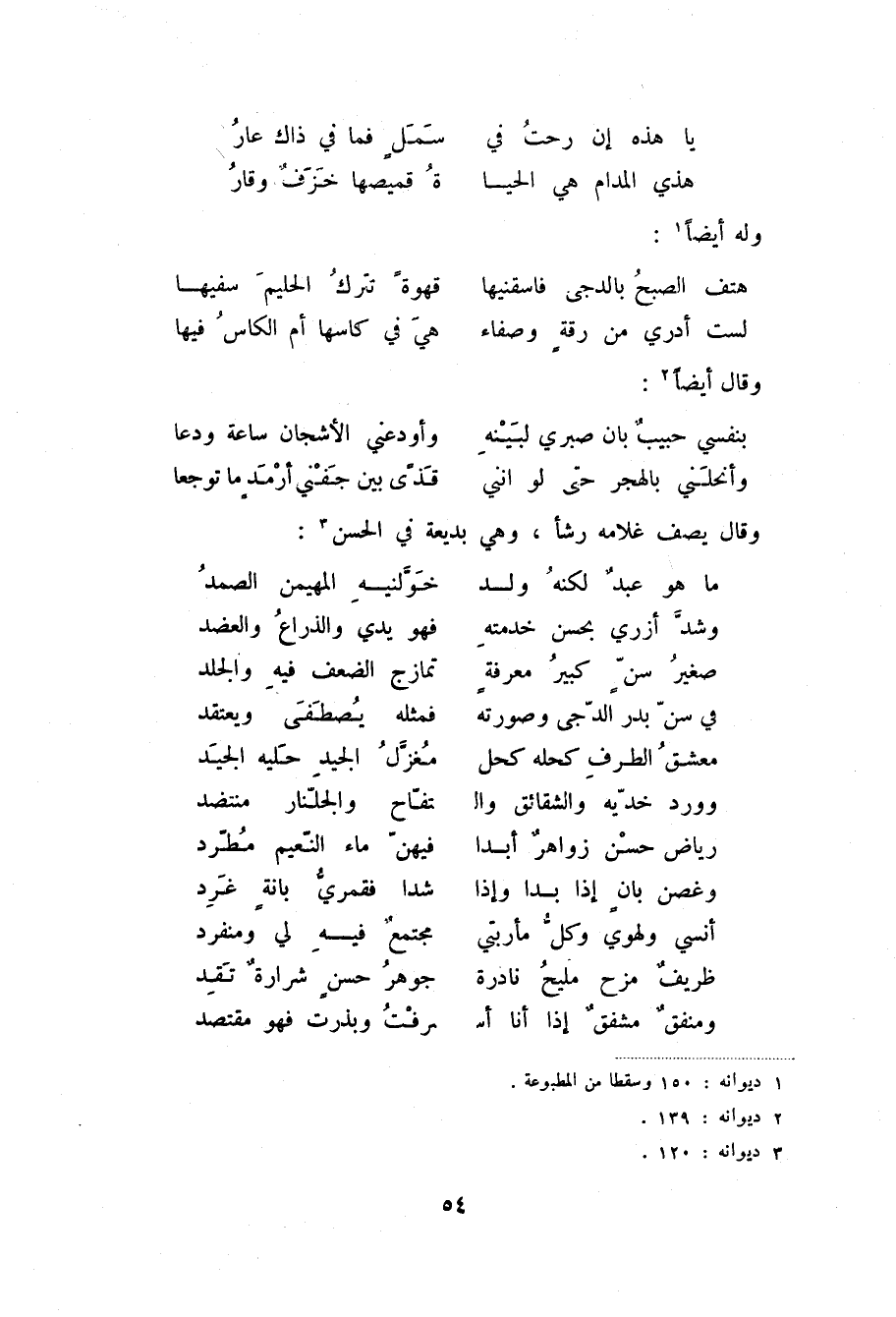وأنحلني بالهجر حتى لو أنني ... قذى بين جفني أرمد ما توجعا وقال يصف غلامه رشأ، وهي بديعة في الحسن (3) :