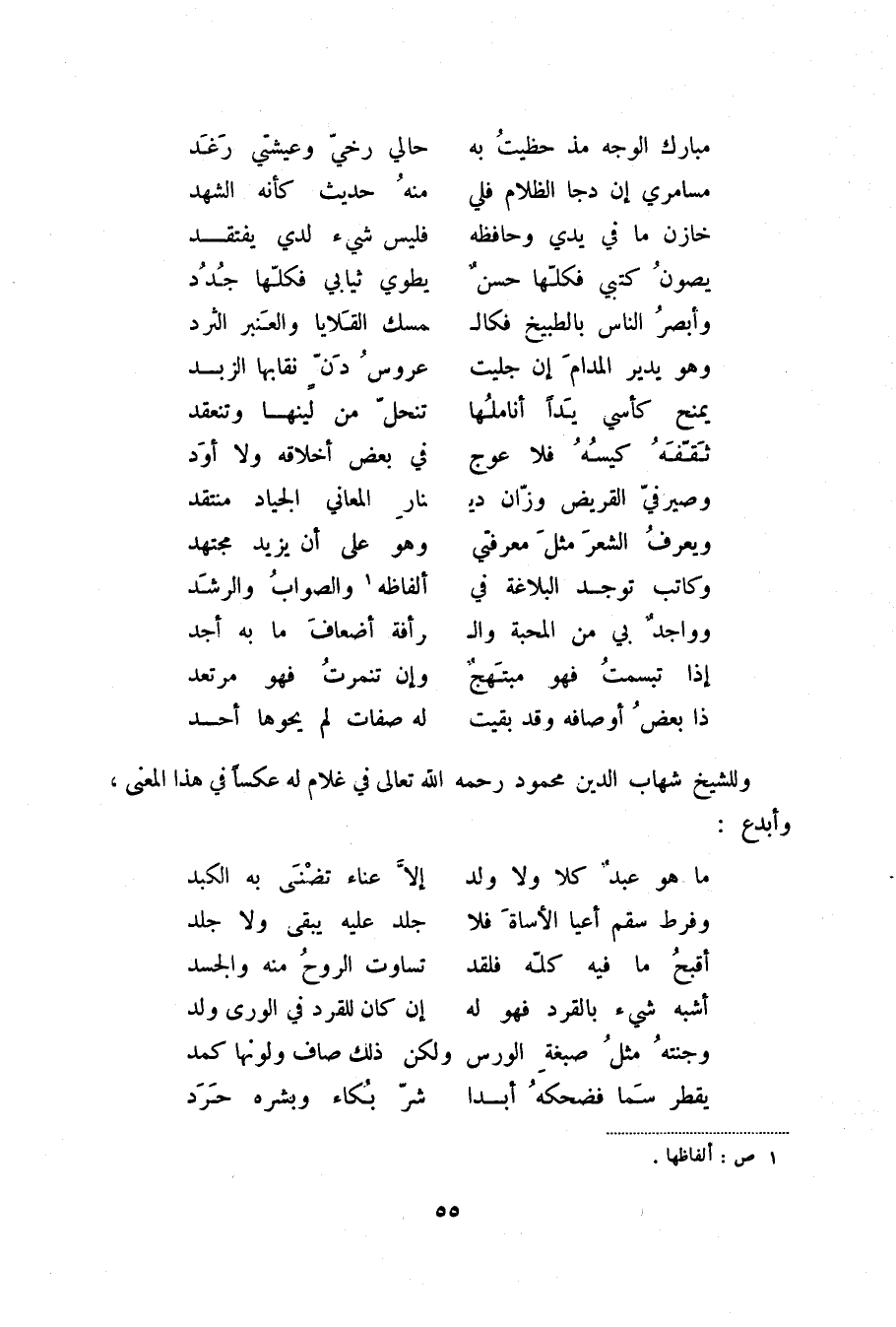 ذا بعض أوصافه وقد بقيت ... له صفات لم يحوها أحد وللشيخ شهاب الدين محمود رحمه الله تعالى في غلام له عكساً في هذا المعنى، وأبدع: