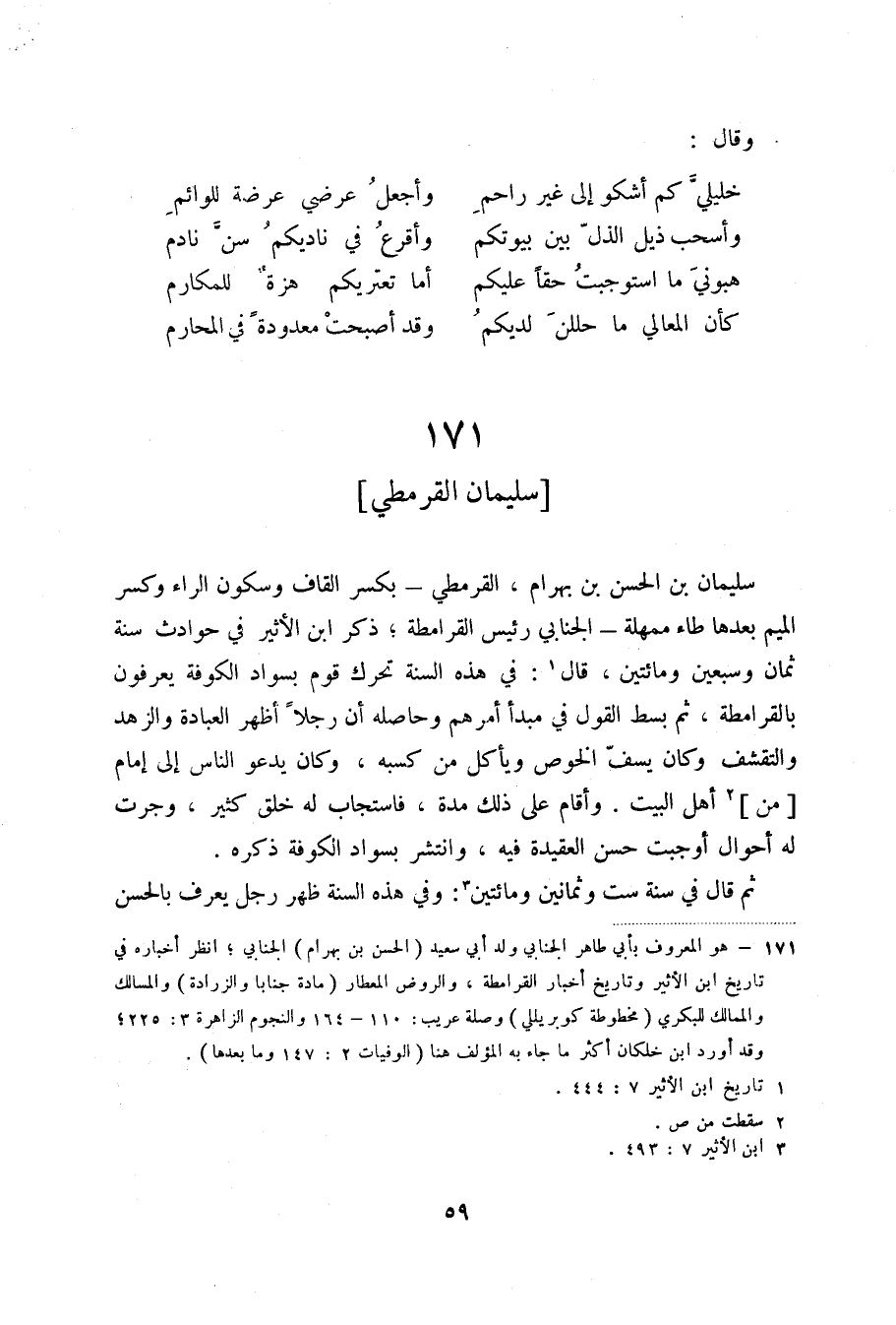 (1) هو المعروف بأبي طاهر الجنابي ولد أبي سعيد (الحسن بن بهرام) الجنابي؛ انظر أخباره في تاريخ ابن الأثير وتاريخ أخبار القرامطة، والروض المعطار (مادة جنابا والزرادة) والمسالك والممالك للبكري (مخطوطة كوبريللي) وصلة عريب: 110 - 164 والنجوم الزاهرة 3: 225؛ وقد أورد ابن خلكان أكثر ما جاء به المؤلف هنا (الوفيات 2: 147) وما بعدها) .
