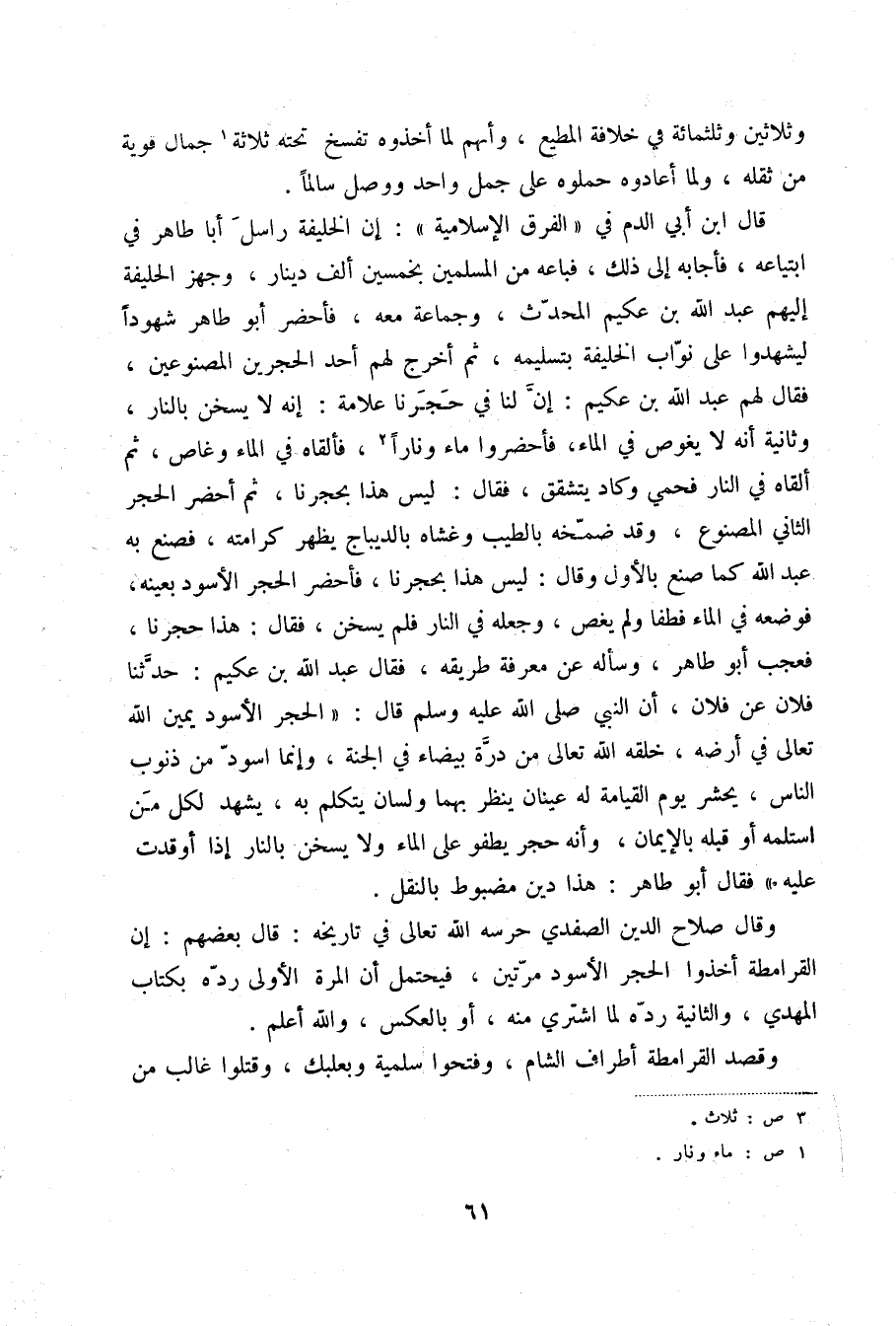 قال ابن أبي الدم في الفرق الإسلامية: إن الخليفة راسل أبا طاهر في ابتياعه، فأجابه إلى ذلك، فباعه من المسلمين بخمسين ألف دينار، وجهز الخليفة إليهم عبد الله بن عكيم المحدث، وجماعة معه، فأحضر أبو طاهر شهوداً ليشهدوا على نواب الخليفة بتسليمه، ثم أخرج لهم أحد الحجرين المصنوعين، فقال لهم عبد الله بن عكيم: إن لنا في حجرنا علامة: إنه لا يسخن بالنار، وثانية أنه لا يغوص في الماء، فأحضروا ماء وناراً (2) ، فألقاه في الماء وغاص، ثم ألقاه في النار فحمي وكاد يتشقق، فقال: ليس هذا بحجرنا، ثم أحضر الحجر الثاني المصنوع، وقد ضمخه بالطيب وغشاه بالديباج يظهر كرامته، فصنع به عبد الله كما صنع بالأول وقال: ليس هذا بحجرنا، فأحضر الحجر الأسود بعينه، فوضعه في الماء فطفا ولم يغص، وجعله في النار فلم يسخن، فقال: هذا حجرنا، فعجب أبو طاهر، وسأله عن معرفة طريقه، فقال عبد الله بن عكيم: حدثنا فلان عن فلان، أن النبي صلى الله عليه وسلم قال: الحجر الأسود يمين الله تعالى في أرضه، خلقه الله تعالى من درة بيضاء في الجنة، وإنما اسود من ذنوب الناس، يحشر يوم القيامة له عينان ينظر بهما ولسان يتكلم به، يشهد لكل من استلمه أو قبله بالإيمان، وأه حجر يطفو على الماء ولا يسخن بالنار إذا أوقدت عليه فقال أبو طاهر: هذا دين مضبوط بالنقل.