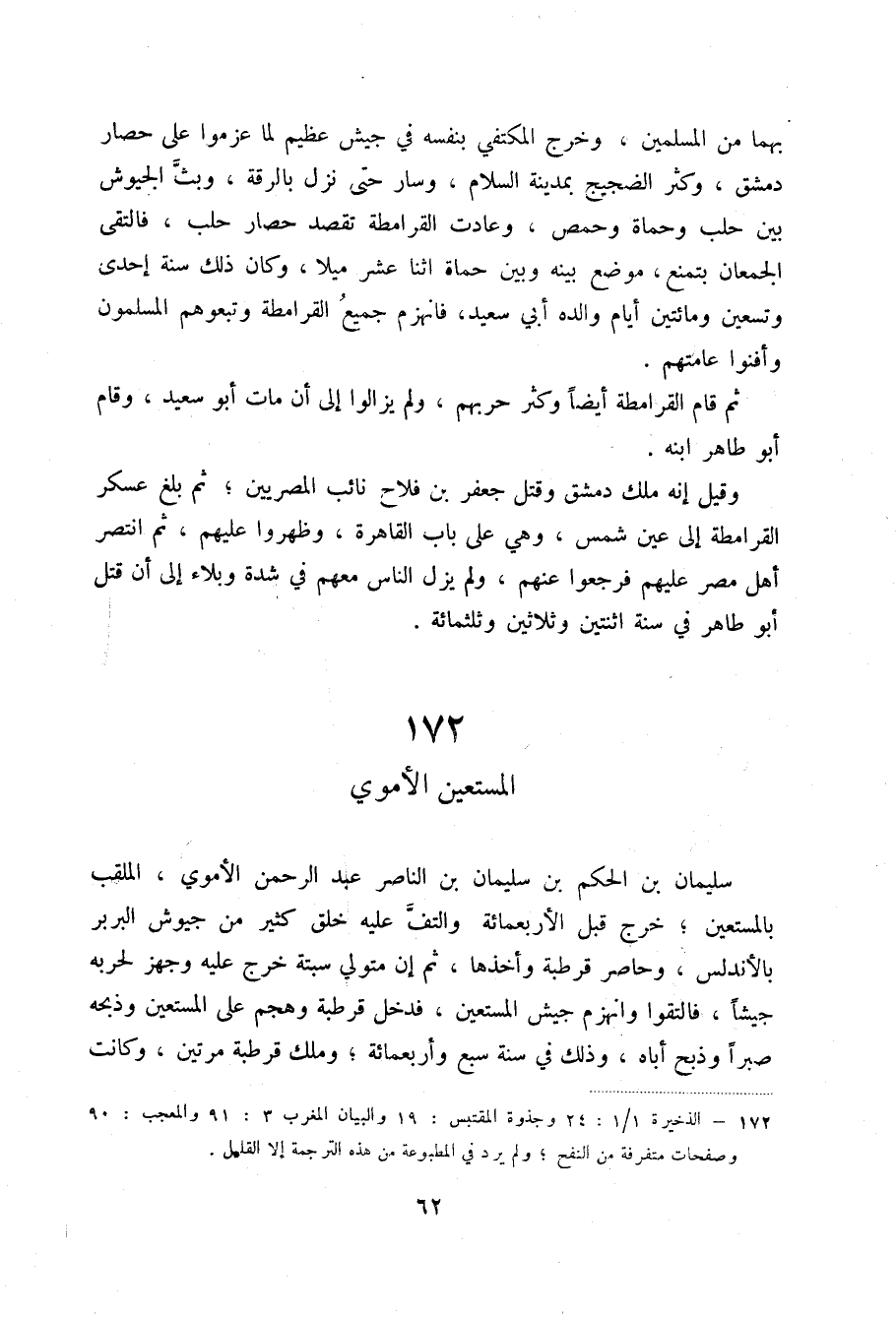 بهما من المسلمين، وخرج المكتفي بنفسه في جيش عظيم لما عزموا على حصار دمشق، وكثر الضجيج بمدينة السلام، وسار حتى نزل بالرقة، وبث الجيوش بين حلب وحماة وحمص، وعادت القرامطة تقصد حصار حلب، فالتقى الجمعان بتمنع، موضع بينه وبين حماة اثنا عشر ميلاً، وكان ذلك سنة إحدى وتسعين ومائتين أيام والده أبي سعيد، فانهزم جميع القرامطة وتبعوهم المسلمون وأفنوا عامتهم.