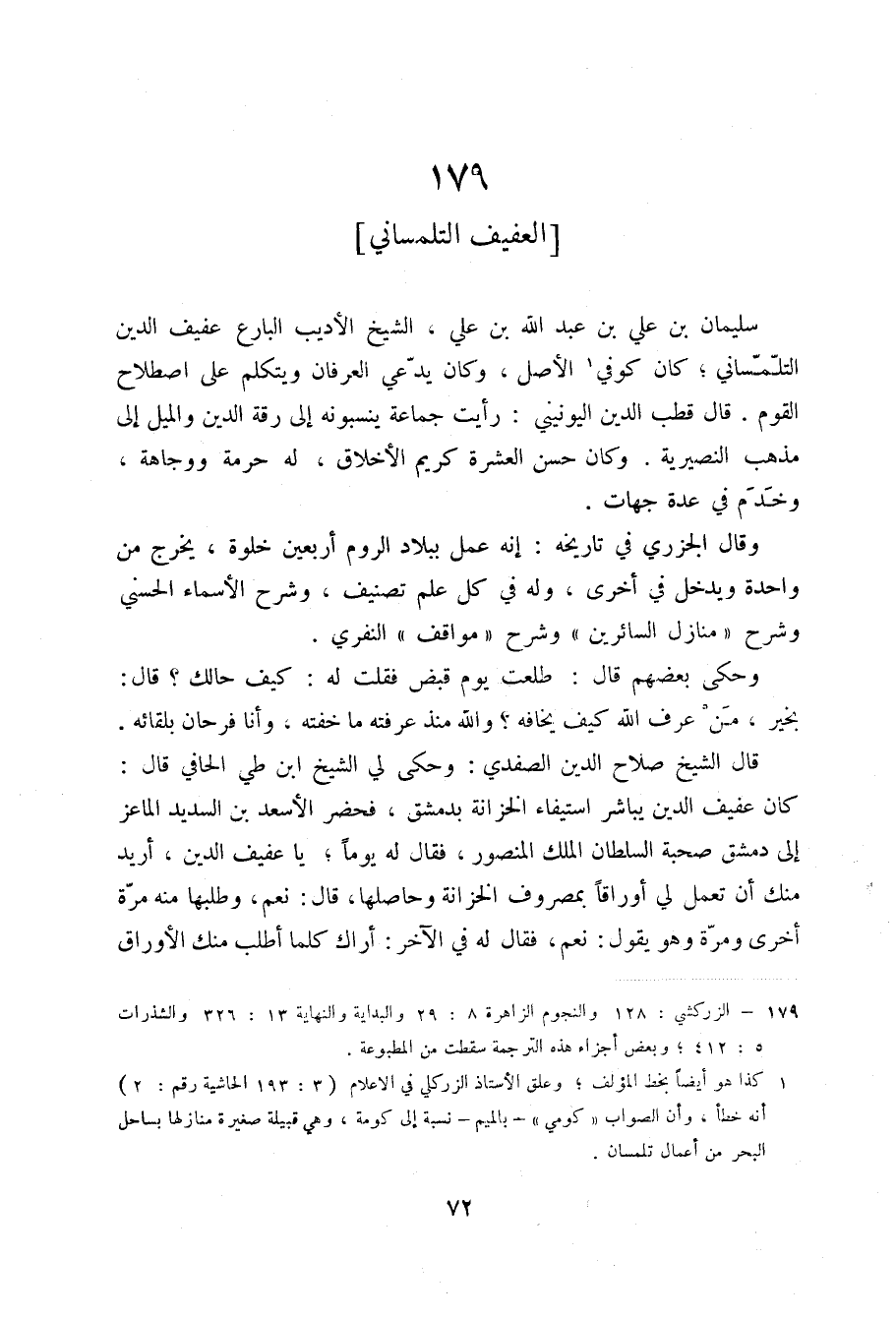 (1) الزركشي: 128 والنجوم الزاهرة 8: 29 والبداية والنهاية 13: 326 والشذرات 5: 412؛ وبعض أجزاء هذه الترجمة سقطت من المطبوعة.