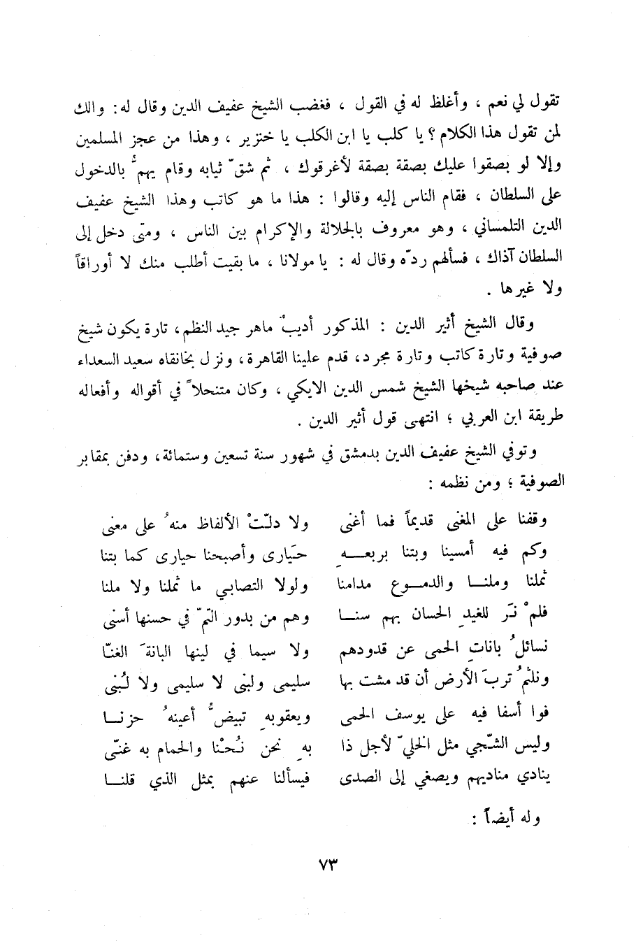 تقول لي نعم، وأغلظ له في القول، فغضب الشيخ عفيف الدين وقال له: والك لمن تقول هذا الكلام؟ يا كلب يا ابن الكلب يا خنزير، وهذا من عجز المسلمين وإلا لو بصقوا عليك بصقة لأغرقوك، ثم شق ثيابه وقام يهم بالدخول على السلطان، فقام الناس إليه وقالوا: هذا ما هو كاتب وهذا الشيخ عفيف الدين التلمساني، وهو معروف بالجلالة والإكرام بين الناس، ومتى دخل إلى السلطان آذاك، فسألهم دره وقال له: يا مولانا ما بقيت أطلب منك لا أوراقاً ولا غيرها.
