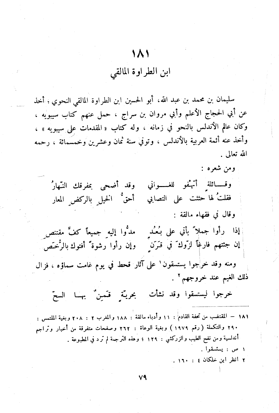سليمان بن محمد بن عبد الله، أبو الحسين بن الطراوة المالقي النحوي؛ أخذ عن أبي الحجاج الأعلم وأبي مروان بن سراج، حمل عنهم كتاب سيبويه، وكان عالم الأندلس بالنحو في زمانه، وله كتاب المقدمات على سيبويه، وأخذ عنه أئمة العربية بالأندلس، وتوفي سنة ثمان وعشرين وخمسمائة، رحمه الله تعالى.