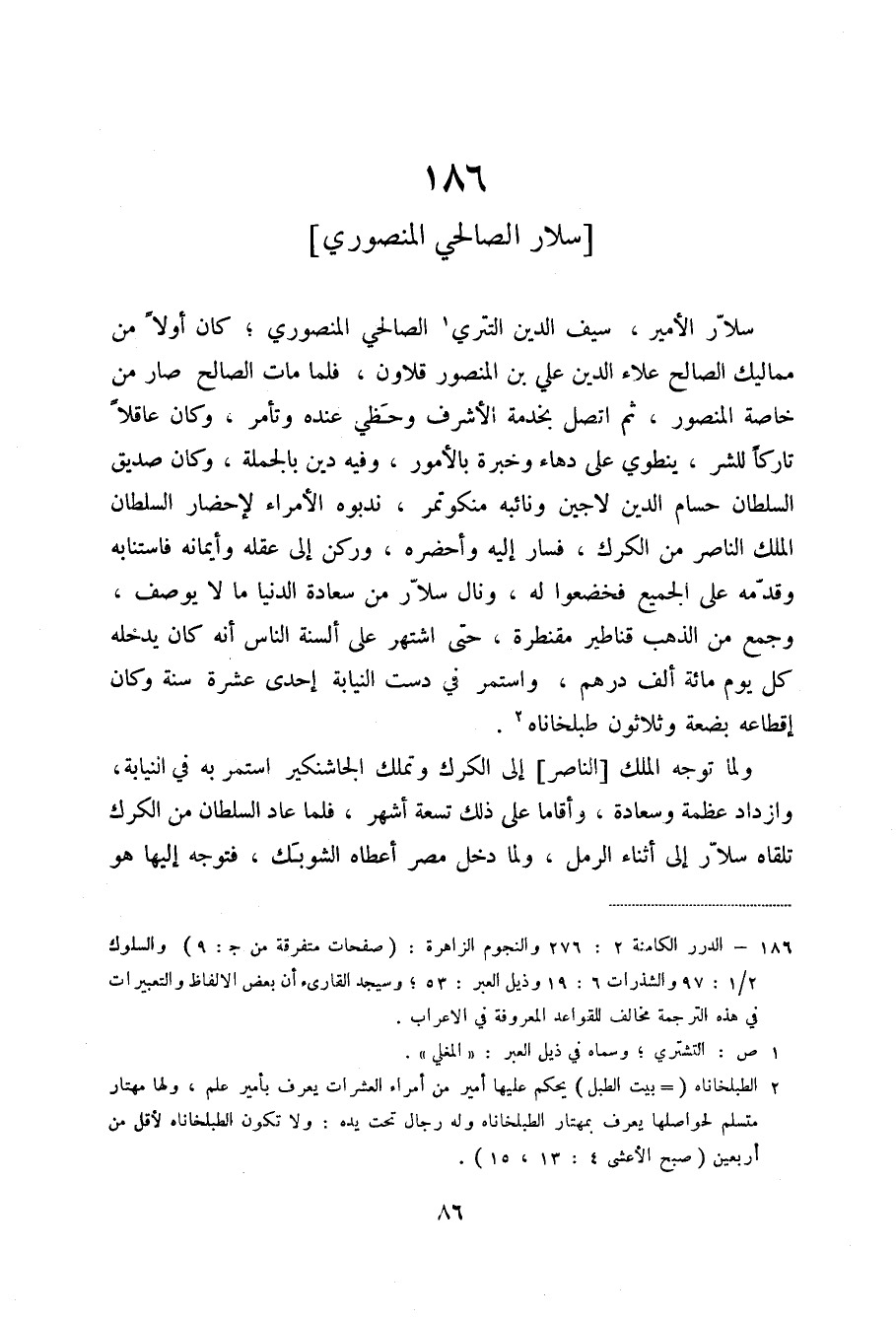 (1) الدرر الكامنة 2: 276 والنجوم الزاهرة: (صفحات متفرقة من ج؟: 9) والسلوك 1/2: 97 والشذرات 6: 19 وذيل العبر: 53؛ وسيجد القارئ أن بعض الفاظ والتعبيرات في هذه الترجمة مخالف للقواعد المعروفة في الأعراب.