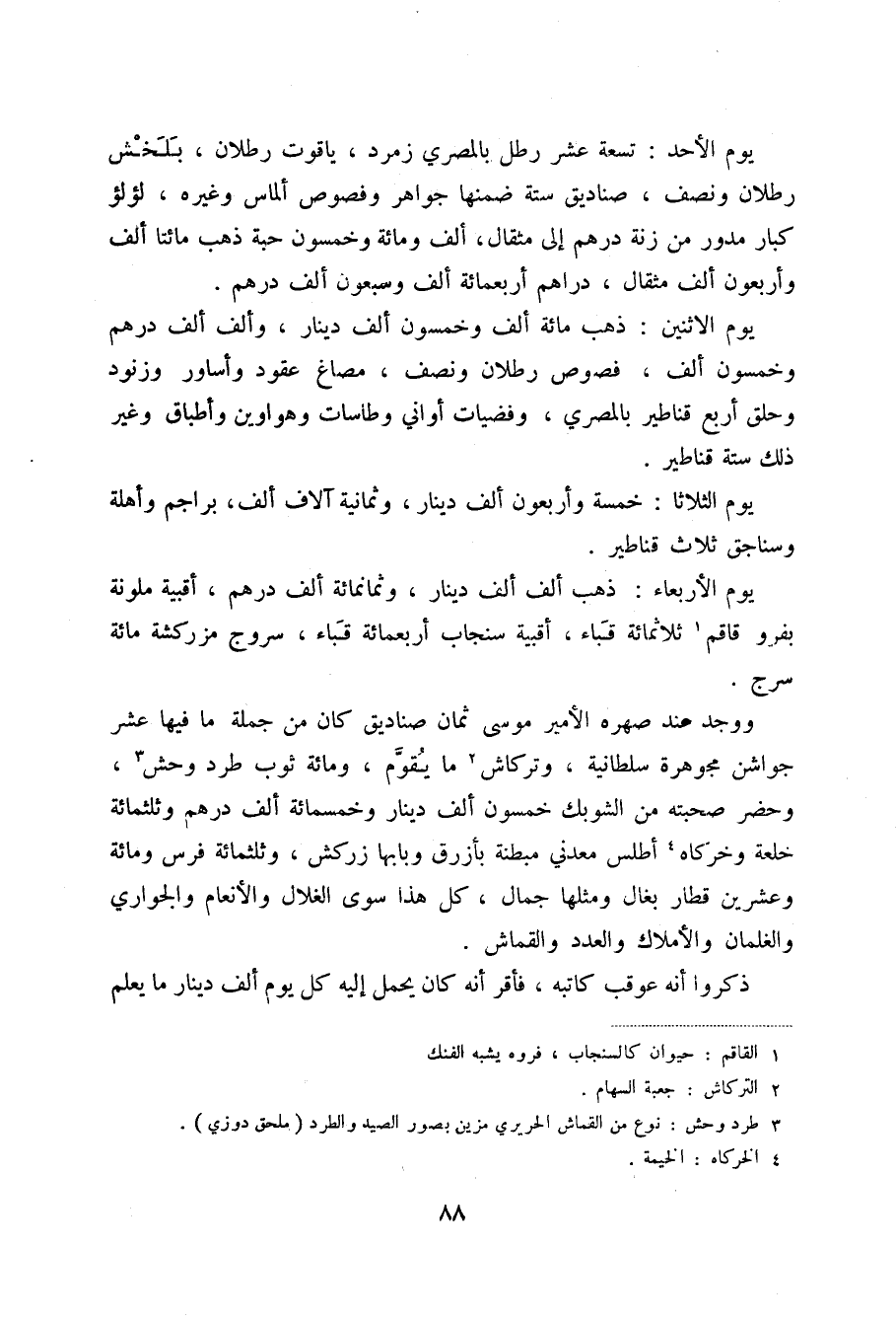 يوم الأربعاء: ذهب ألف ألف دينار، وثمانمائة ألف درهم، أقبية ملونة بفرو قاقم (1) ثلاثمائة قباء، أقبية سنجاب أربعمائة قباء، سروج مزركشة مائة سرج.