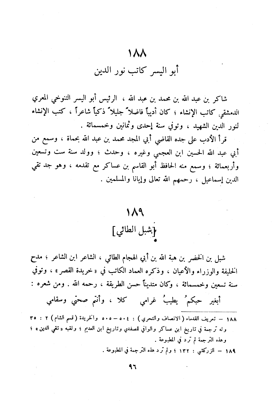 (1) تعريف القدماء (الأنصاف والتحري) : 504 - 505 والخريدة (قسم الشام) 2: 35 وله ترجمة في تاريخ ابن عساكر والوافي للصفدي وتاريخ ابن العديم؛ ولقبه ((تقي الدين)) ؛ وهذه الترجمة لم ترد في المطبوعة.