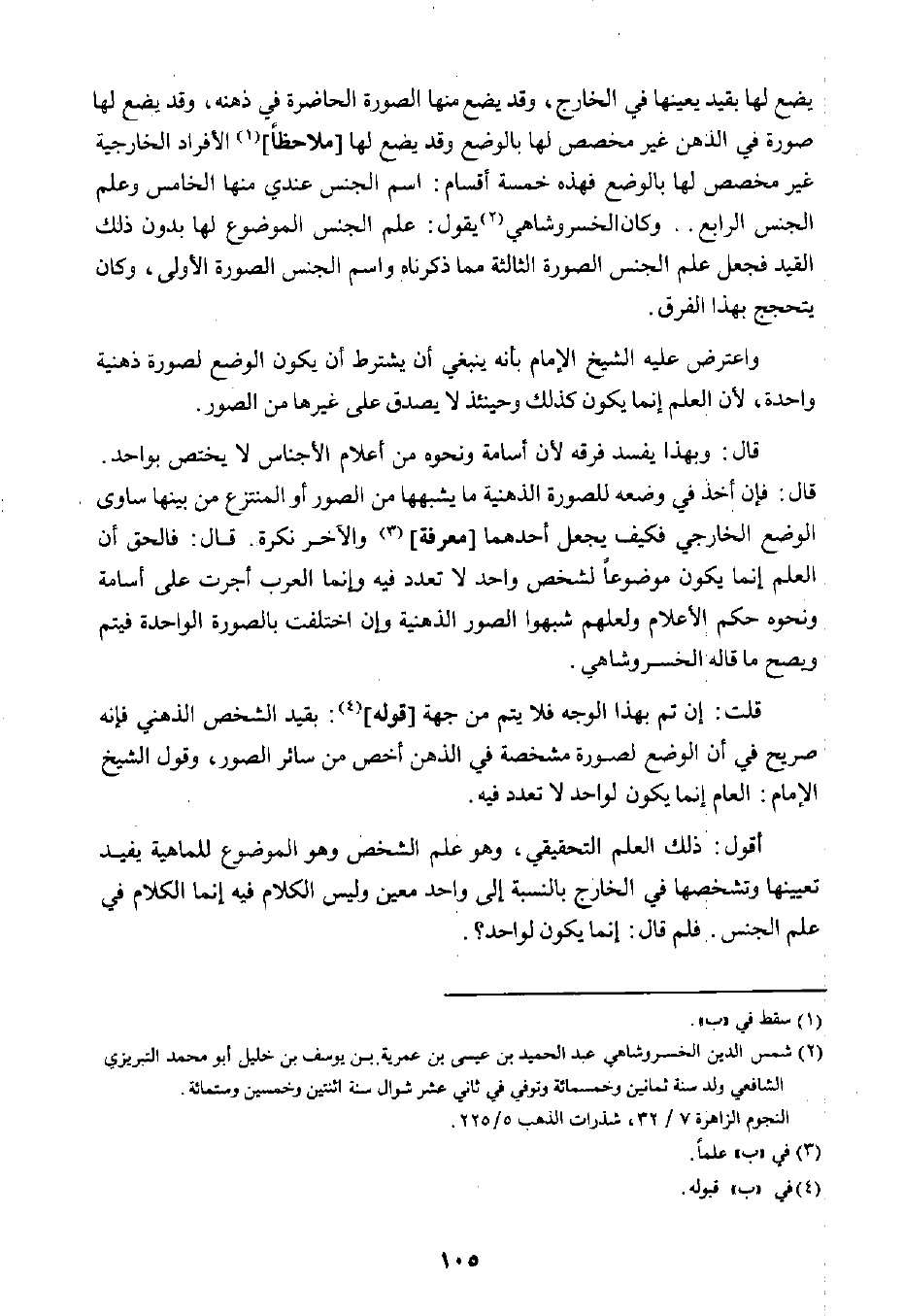 قال: وبهذا يفسد فرقه لأن أسامة ونحوه من أعلام الأجناس لا يختص بواحد. قال: فإن أخذ في وضعه للصورة الذهنية ما يشبهها من الصور أو المنتزع من بينها ساوي الوضع الخارجي فكيف يجعل أحدهما [معرفة] ٣ والآخر نكرة. قال: فالحق أن العلم إنما يكون موضوعًا لشخص واحد لا تعدد فيها وإنما العرب أجرت على أسامة ونحوه حكم الأعلام ولعلهم شبهوا الصورة الذهنية وإن اختلفت بالصورة الواحدة فيتم ويصح ما قاله الخسر وشاهي.