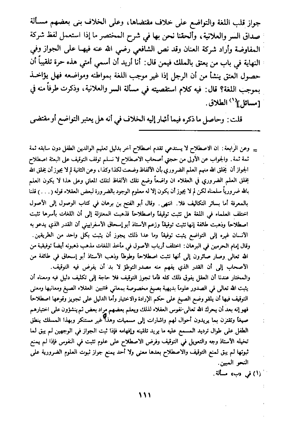 = وعن الرابعة: أن الاصطلاح لا يستدعي تقدم اصطلاح آخر بدليل تعلم الوالدين الطفل دون سابقه ثمة ثمة ثمة. والجواب عن الأولى من حجتي أصحاب الاصطلاح لا نسلم توقف التوقيف على البعثة اصطلاح الجواز أن يخلق الله منهم العلم الضروري بأن الألفاظ وضعت لكذا وكذا، وعن الثانية لا يجوز أن يخلق الله يخلق العلم الضروري في العقلاء أن واضعًا وضع تلك الألفاظ لتلك المعاني وعلى هذا لا يكون العلم بالله ضروريًا سلمناه لكن لم لا يجوز أن يكون إلا له معلوم الوجود بالضرورة لبعض العقلاء قوله " ... " قلنا بالمعرفة أما بسائر التكاليف فلا. انتهى. وقال أبو الفتح بن برهان في كتاب الوصول إلى الأصول اختلف العلماء في اللغة هل تثبت توقيفًا واصطلاحًا فذهبت المعتزلة إلى أن اللغات بأسرها تثبت اصطلاحًا وذهبت طائفة إنها تثبت توفيقًا، وزعم الأستاذ أبو إسحاق الإسفراييني أن القدر الذي يدعو به الإنسان غيره إلى التواضع يثبت توفيقًا، وما عدا ذلك يجوز أن يثبت بكل واحد من الطرفين. وقال إمام الحرمين في البرهان: اختلف أرباب الأصول في مأخذ اللغات مذهب ذهبوه أيضًا توفيقية من الله تعالى وصار صائرون إلى أنها تثبت اصطلاحًا وطوطًا وذهب الأستاذ أبو إسحاق في طائفة من الأصحاب إلى أن القدر الذي يفهم منه مصدر التواطؤ لا بد أن يفرض فيه التوقيف.