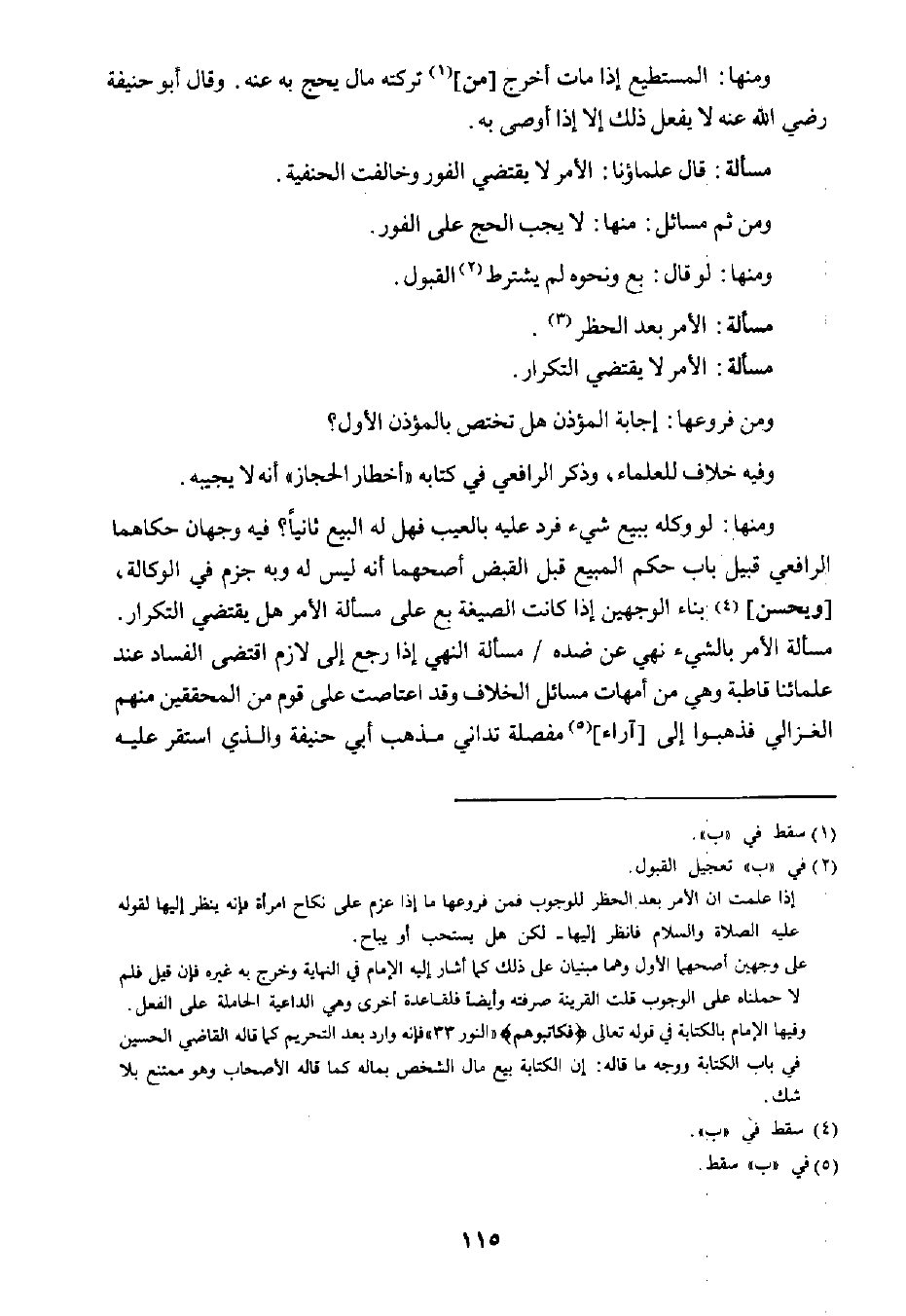 ومنها: لو وكله بيع شيء فرد عليه بالعيب فهل له البيع ثانيًا؟ فيه وجهان؛ حكاهما الرافعي قبيل باب حكم المبيع قبل القبض أصحهما أنه ليس له وبه جزم في الوكالة، [ويحسن] ٤ بناء الوجهين إذا كانت الصيغة بع على مسألة الأمر هل يقتضي التكرار. مسألة الأمر بالشيء نهي عن ضده؛ مسألة النهي إذا رجع إلى لازم اقتضى الفساد عند علمائنا قاطبة وهي من أمهات مسائل الخلاف وقد اعتاضت على قوم من المحققين منهم الغزوالي فذهبوا إلى [آراء] ٥ مفصلة تداني مذهب أبي حنيفة والذي استقر عليه