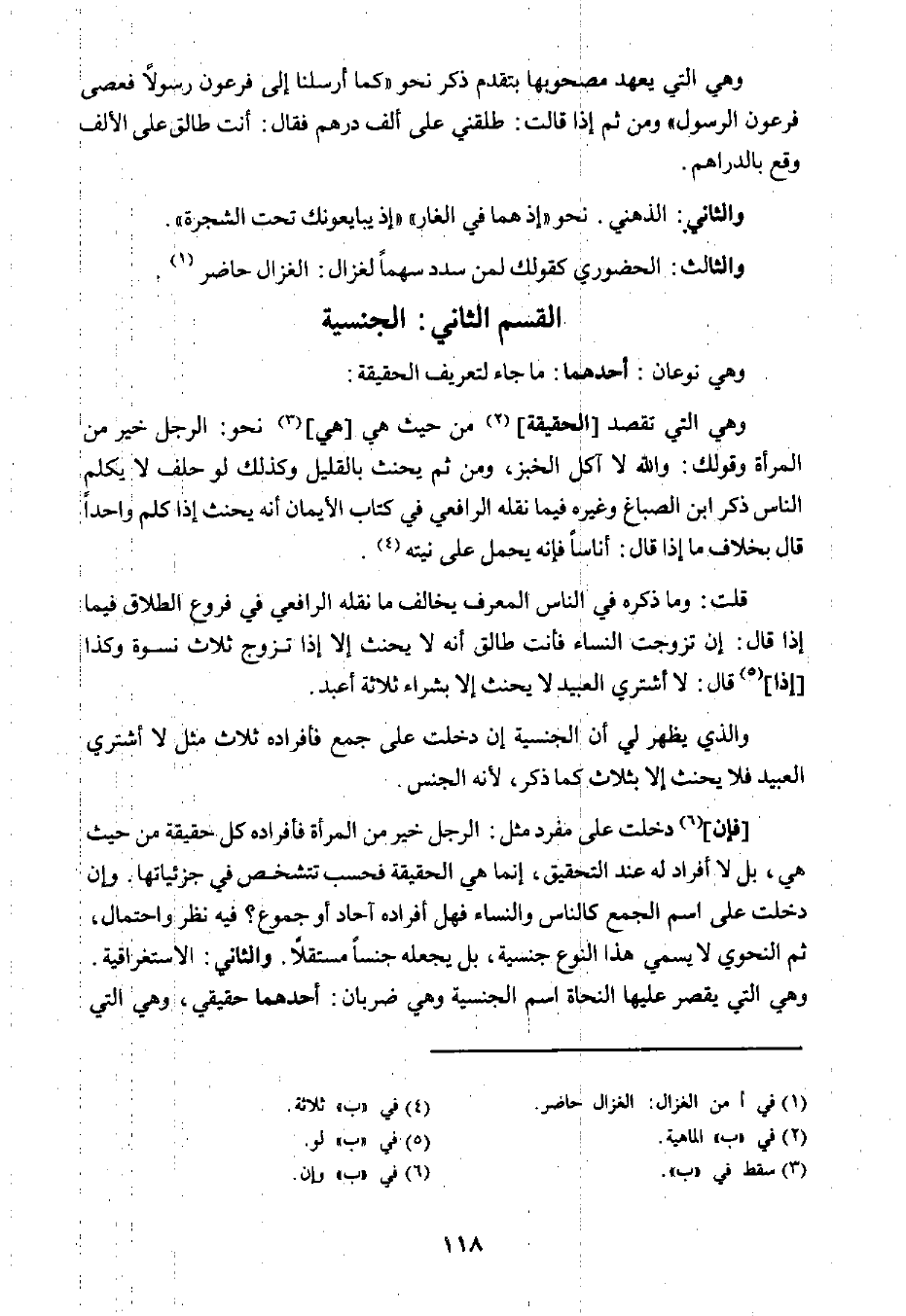 [فإن] ٦ دخلت على مفرد مثل: الرجل خير من المرأة فأفراده كل حقيقة من حيث هي؛ بل أفراد له عند التحقيق؛ إنما هي الحقيقة فحسب تشخص في جزئياتها، وإن دخلت على اسم الجمع كالناس والنساء فهل أفراده آحاد أو جموع؟ فيه نظر واحتمال، ثم النحوي لا يسمى هذا النوع جنسية؛ بل يجعله جنسًا مستقلًا. والثاني: الاستغراقية. وهي التي يقصر عليها النحاة اسم الجنسية وهي ضربان: أحدهما حقيقي، وهي التي
