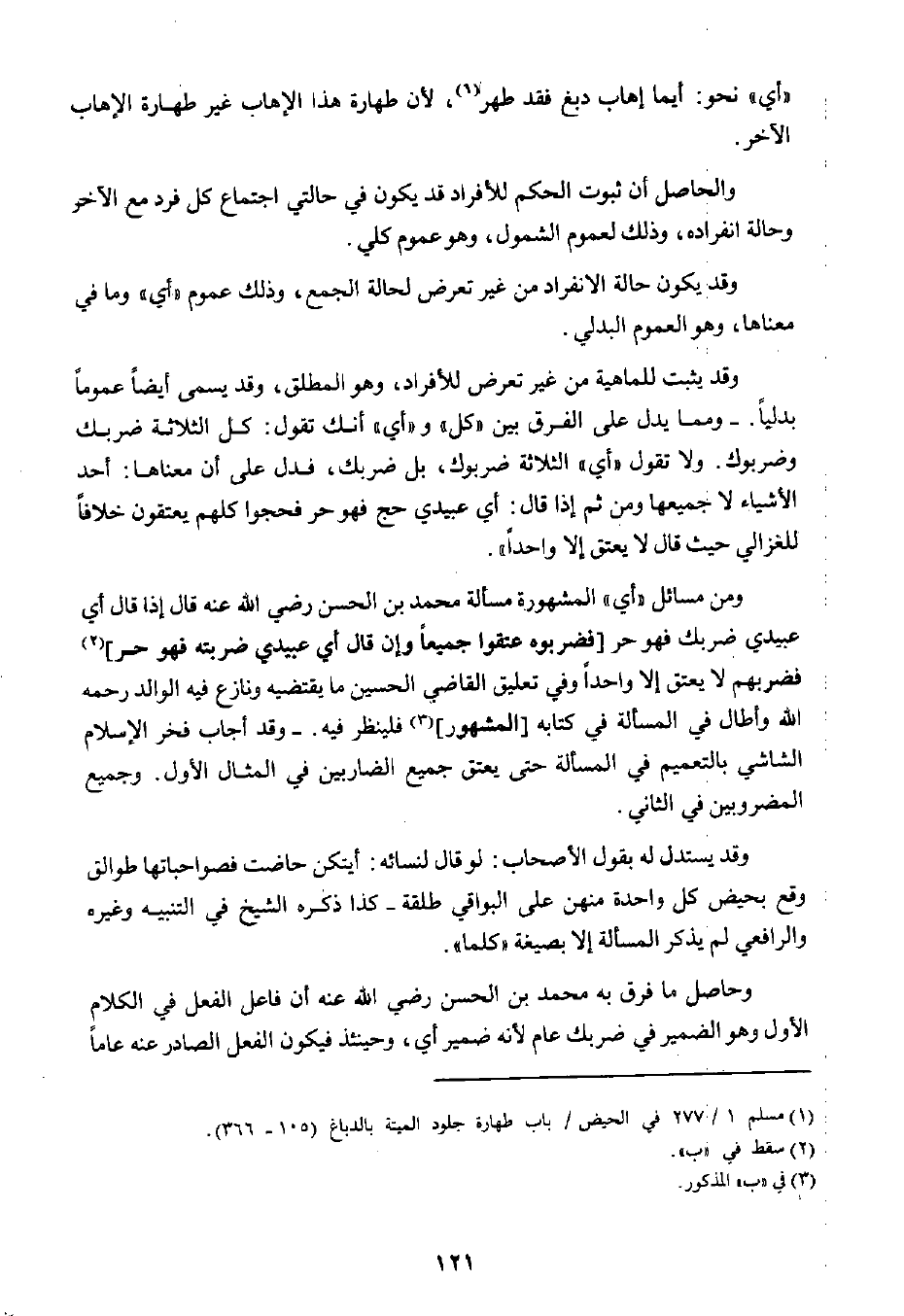 وقد يثبت للماهية من غير تعرض للأفراد، وهو المطلق، وقد يسمى أيضًا عمومًا بدليًا. ومما يدل على الفرق بين "كل" و"أي" أنك تقول: كل الثلاثة ضربك وضربوك. ولا تقول "أي" الثلاثة ضربوك، بل ضربك؛ فدل على أن معناها: أحد الأشياء لا جميعها ومن ثم إذا قال: أي عبيدي حج فهو حر فحجوا كلهم يعتقون خلافًا للغزالي حيث قال لا يعتق إلا واحدًا".