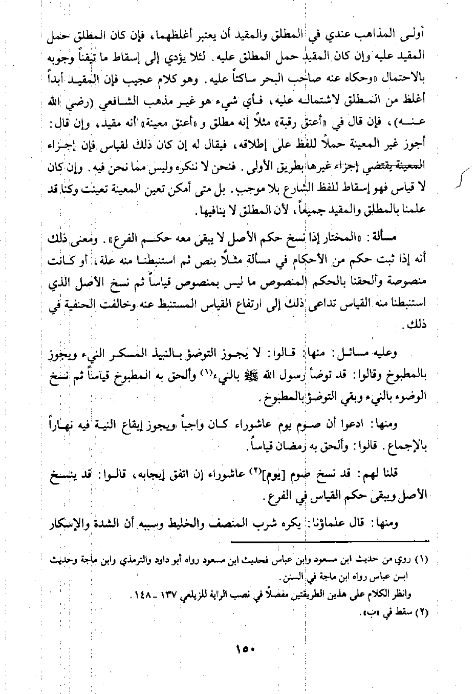 وعليه مسائل: منها: قالوا: لا يجوز التوضؤ بالنبيذ المسكر النيء ويجوز بالمطبوخ وقالوا: قد توضأ رسول الله صلى الله عليه وسلم بالنيء١ وألحق به المطبوخ قياسًا ثم نسخ الوضوء بالنيء وبقي التوضؤ بالمطبوخ.