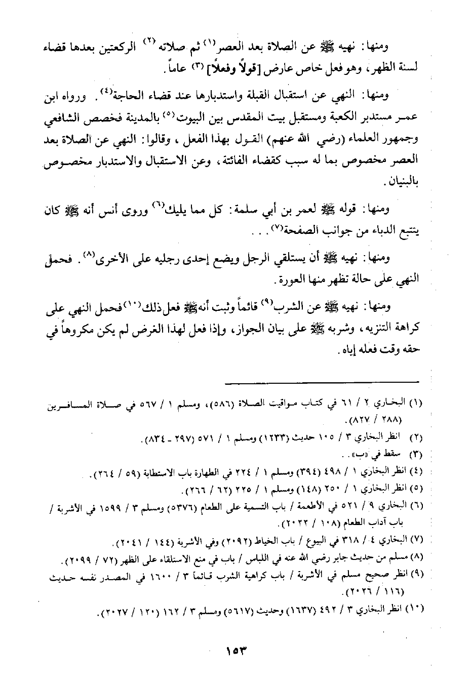 ومنها: النهي عن استقبال القبلة واستدبارها عند قضاء الحاجة٤. ورواه ابن عمر مستدبر الكعبة ومستقبل بيت المقدس بين البيوت٥ بالمدينة فخصص الشافعي وجمهور العلماء "رضي الله عنهم" القول بهذا الفعل، وقالوا: النهي عن الصلاة بعد العصر مخصوص بما له سبب كقضاء الفائتة، وعن الاستقبال والاستدبار مخصوص بالبنيان.