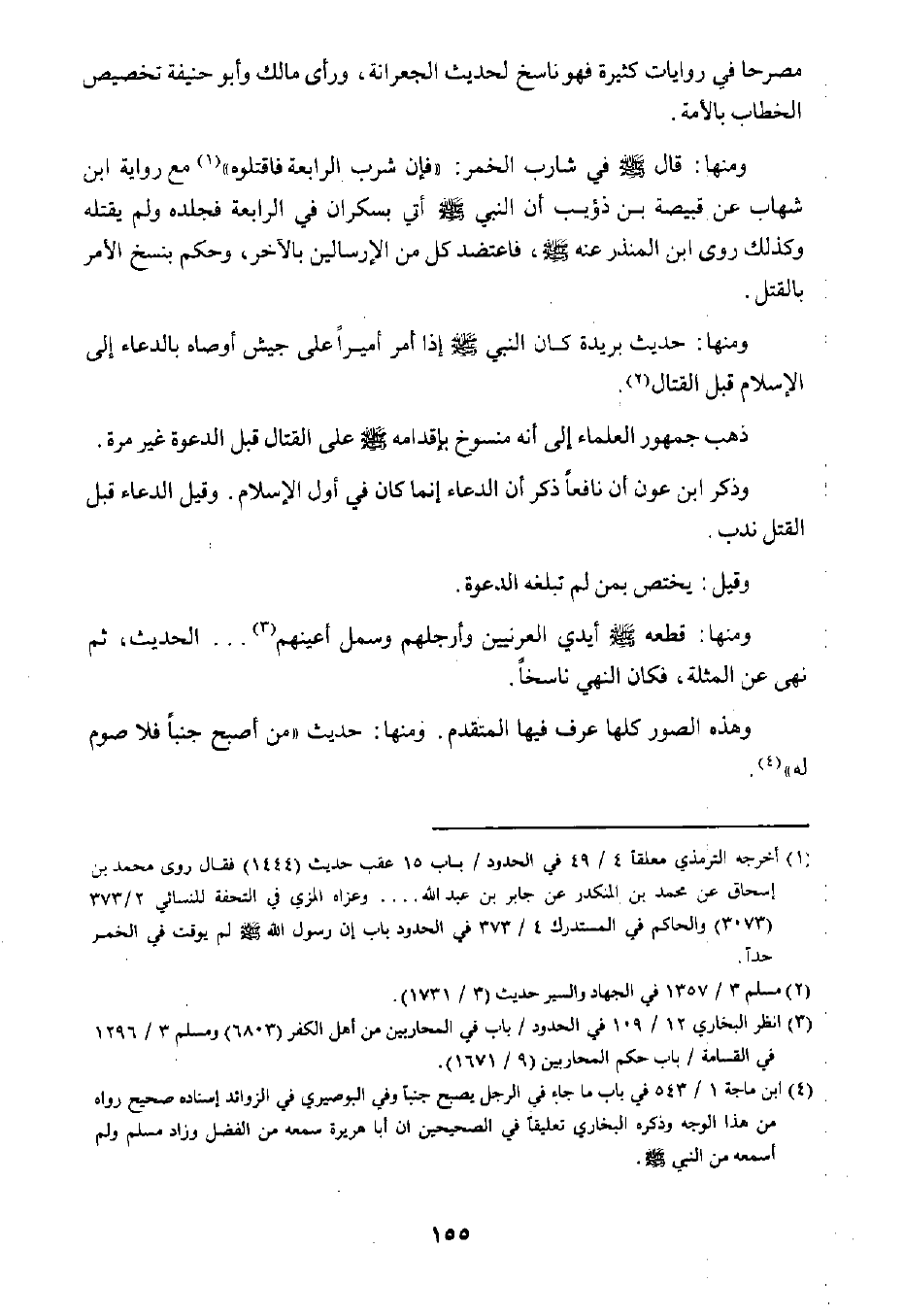 ومنها: قال صلى الله عليه وسلم في شارب الخمر: "فإن شرب الرابعة فاقتلوه" ١ مع رواية ابن شهاب عن قبيصة بن ذؤيب أن النبي صلى الله عليه وسلم أتى بسكران في الرابعة فجلده ولم يقتله وكذلك روى ابن المنذر عنه صلى الله عليه وسلم، فاعتضد كل من الإرسالين بالآخر، وحكم بنسخ الأمر بالقتل.