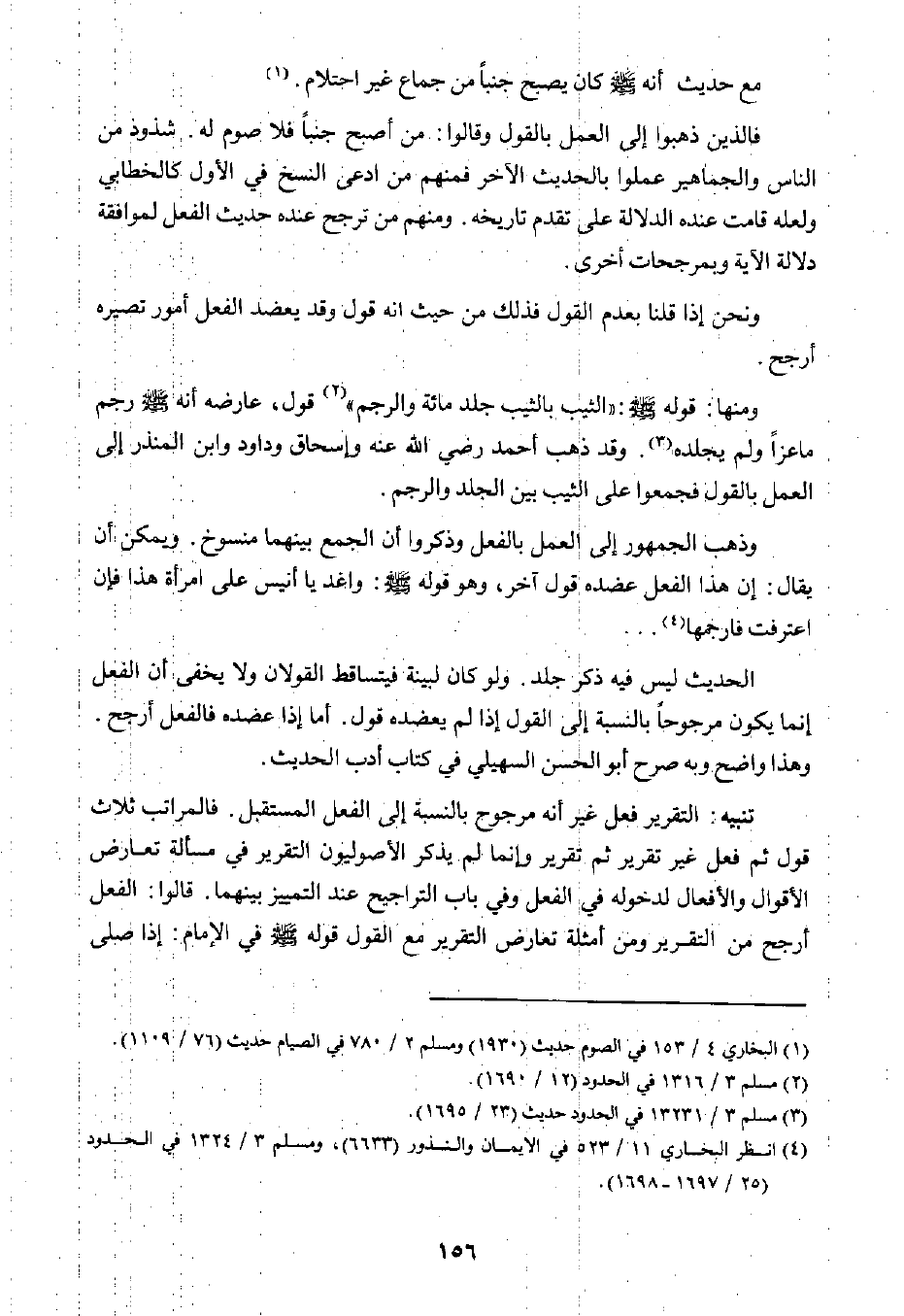 فالذين ذهبوا إلى العمل بالقول، وقالوا: من أصبح جنبًا فلا صوم له. شذوذ من الناس والجماهير عملوا بالحديث الآخر مفنهم من ادعى النسخ في الأول كالخطابي ولعله قامت عنده الدلالة على تقدم تاريخه، ومنهم من ترجح عنده حديث الفعل لموافقة دلالة الآية وبمرجحات أخرى.