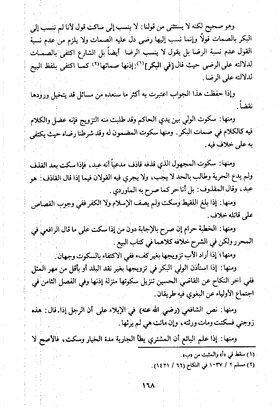 ومنها: سكوت الولي بين يدي الحاكم وقد طلبت منه التزويج فإنه عضل والكلام فيه كالكلام في صمات البكر، ومنها سكوت المضمون له وقد شرطنا رضاه؛ حيث يكتفي به على خلاف فيه.