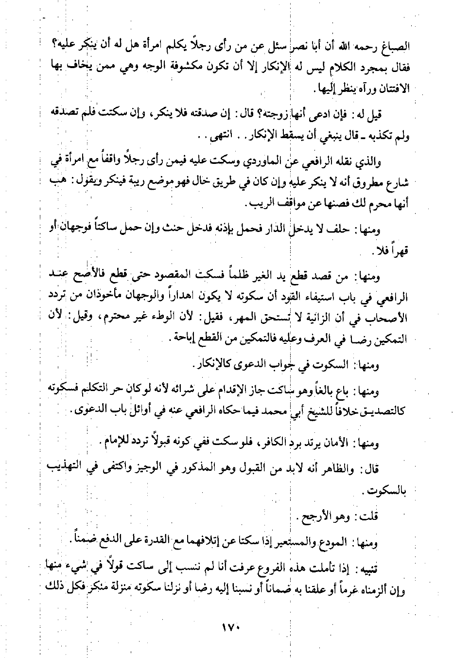 ومنها: باع بالغًا وهو ساكت جاز الإقدام على شرائه لأنه لو كان حر التكلم فسكوته كالتصديق خلافًا للشيخ أبي محمد فيما حكاه الرافعي عنه في أوائل باب الدعوى.