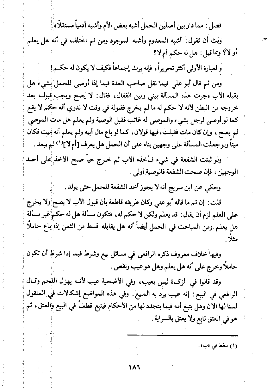 قلت: إن تم ما قاله أبو علي وكان طريقه قاطعة بأن قبول الأب لا يصح ولا يخرج على العلم لزم أن يقال: قد يعلم ولحكن لا حكم له؛ فتكون مسألة هل له حكم غير مسألة هل يعلم. ومن المباحث في الحمل أيضًا أنه هل يقابله قسط من الثمن إذا باع حاملًا مثلًا.