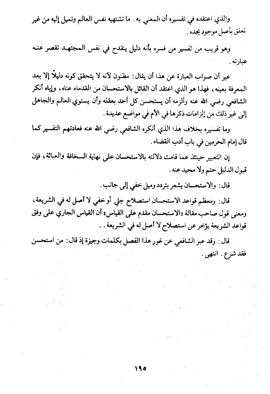 غير أن صواب العبارة عن هذا أن يقال: مظنون لأنه لا يتحقق كونه دليلًا إلا بعد المعرفة بعينه، فهذا هو الذي اعتقد أن القائل بالاستحسان من القدماء عناه، وإياه أنكر الشافعي رضي الله عنه وألزمه أن يستحسن كل أحد بعقله وأن يستوي العالم والجاهل إلى غير ذلك من إلزامات ذكرها في الأم في مواضع عديدة.