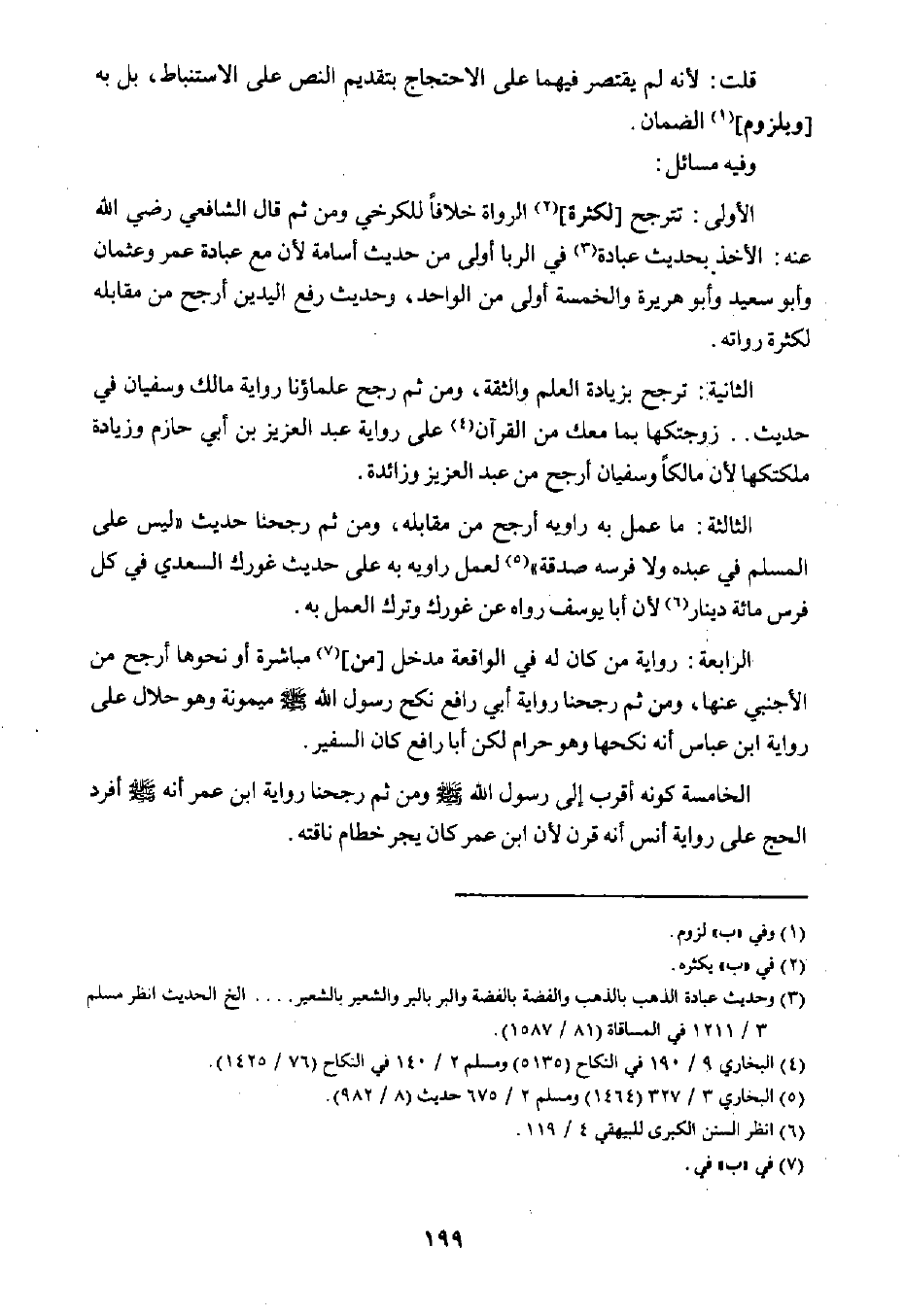 الأولى: تترجح [لكثرة] ٢ الرواة خلافًا للكرخي ومن ثم قال الشافعي رضي الله عنه: الأخذ بحديث عبادة٣ في الربا أولى من حديث أسامة لأن مع عبادة عمر وعثمان وأبو سعيد وأبو هريرة والخمسة أولى من الواحد، وحديث رفع اليدين أرجح من مقابله لكثرة رواته.