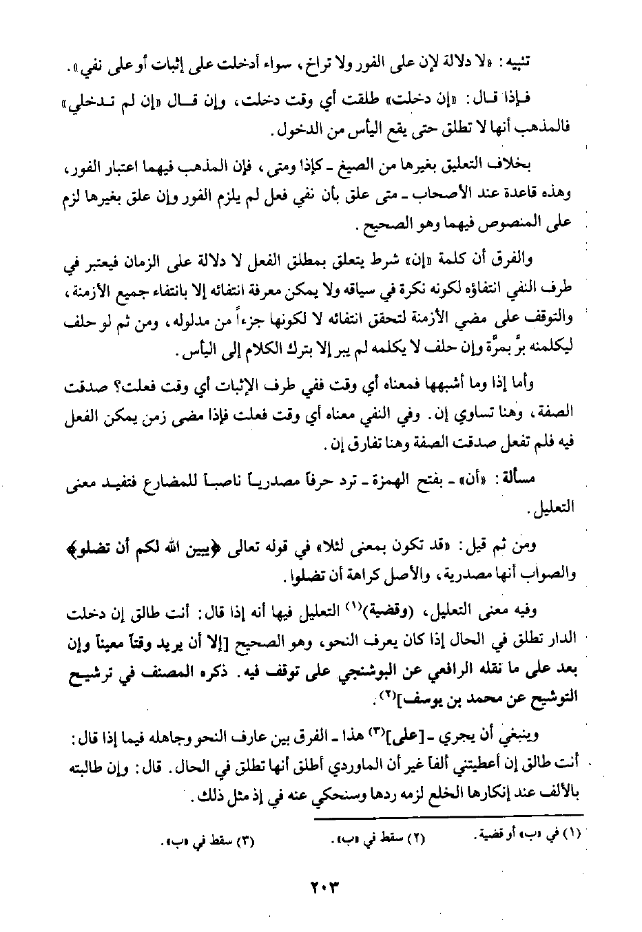 والفرق أن كلمة "إن" شرط يتعلق بمطلق الفعل لا دلالة على الزمان فيعتبر في طرف النفي انتفاؤه لكونه نكرة في سياقه ولا يمكن معرفة انتفائه إلا بانتفاء جميع الأزمنة، والتوقف على مضي الأزمنة لتحقق انتفائه لا لكونها جزءًا من مدلوله، ومن ثم لو حلف ليكلمنه بر بمرة وإن حلف لا يكلمه لم يبر إلا بترك الكلام إلى اليأس.