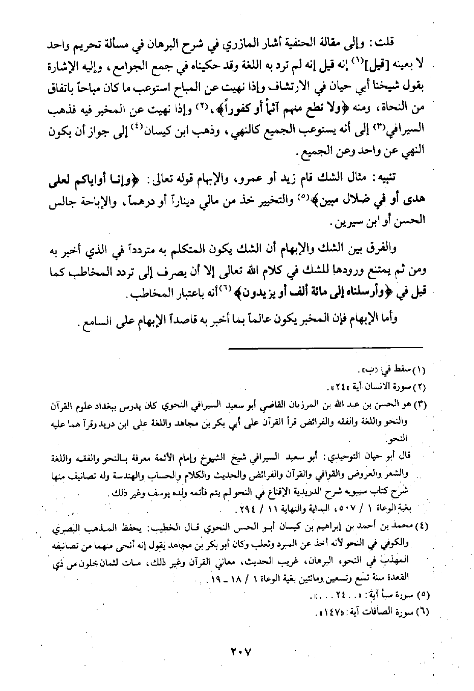 قلت: وإلى مقالة الحنفية أشار المازري في شرح البرهان في مسألة تحريم واحد لا بعينه [قيل] ١ إنه قيل إنه لم ترد به اللغة وقد حكيناه في جمع الجوامع، وإليه الإشارة بقول شيخنا أبي حيان في الارتشاف وإذا نهيت عن المباح استوعب ما كان مباحًا باتفاق من النحاة، ومنه {وَلَا تُطِعْ مِنْهُمْ آَثِمًا أَوْ كَفُورًا} ٢ وإذا نهيت عن المخير فيه فذهب السرافي٣ إلى أنه يستوعب الجميع كالنهي، وذهب ابن كيسان٤ إلى جواز أن يكون النهي عن واحد وعن الجميع.