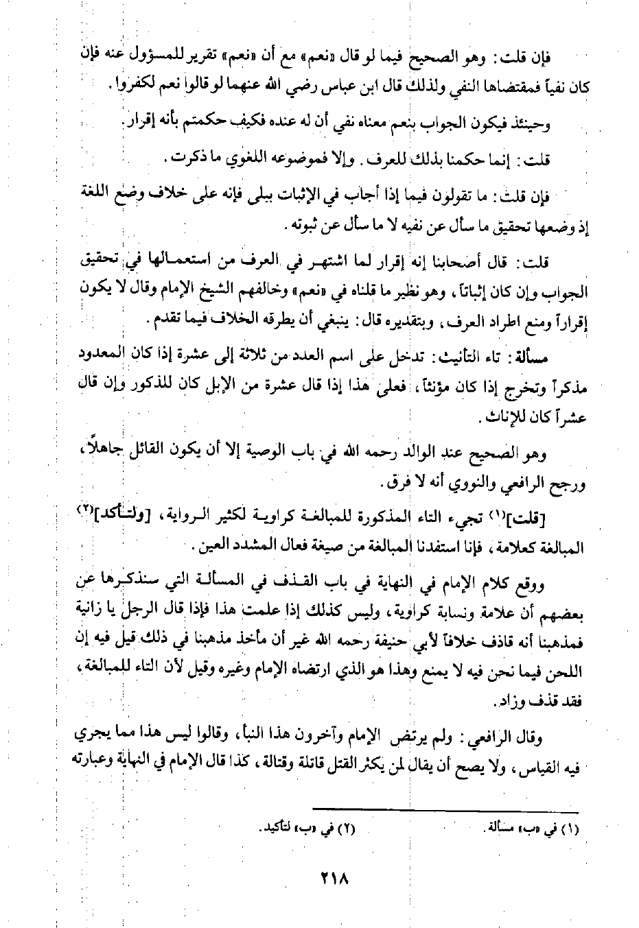 ووقع كلام الإمام في النهاية في باب القذف في المسألة التي سنذكرها عن بعضهم أن علامة ونسابة كراوية، وليس كذلك إذا علمت هذا فإذا قال الرجل: يا زانية فمذهبنا أنه قاذف خلافًا لأبي حنيفة رحمه الله؛ غير أن مأخذ مذهبنا في ذلك قيل فيه إن اللحن فيما نحن فيه لا يمنع وهذا هو الذي ارتضاه الإمام وغيره وقيل لأن التاء للمبالغة؛ فقد قذف وزاد.