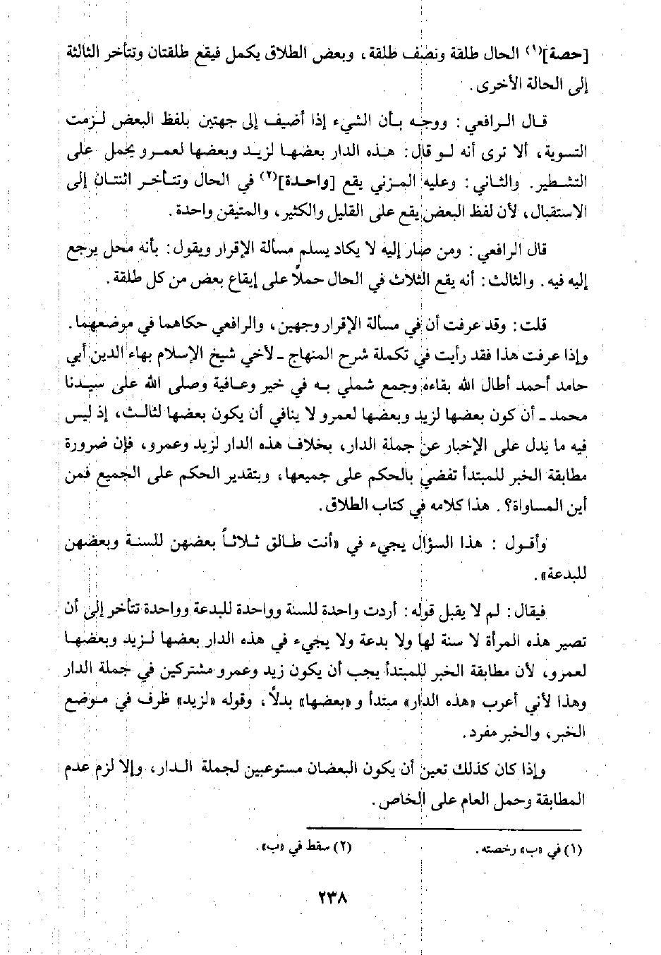 فيقال: لم لا يقبل قوله: أردت واحدة للسنة وواحدة للبدعة وواحدة تتأخر إلى أن تصير هذه المرأة لا سنة لها ولا بدعة ولا يجيء في هذه الدار بعضها لزيد وبعضها لعمرو؛ لأن مطابقة الخبر للمبتدأ يجب أن يكون زيد وعمرو مشركين في جملة الدار وهذا لأبي أعرب "هذه الدار" مبتدأ و "بعضها" بدلًا، وقوله "لزيد" ظرف في موضع الخبر، والخبر مفرد.