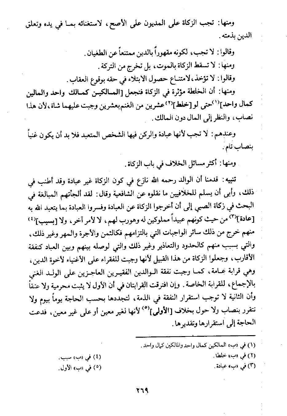 تنبيه: قدمنا أ، الوالد رحمه الله نازع في كون الزكاة غير عبادة وقد أطنب في ذلك، وأبى أن يسلم للخلافيين ما نقلوه عن الشافعية وقال: لقد ألجأتهم المبالغة في البحث في زكاة الصبي إلى أن أخرجوا الزكاة عن العبادة وفسروا العبادة بما يتعبد الله به [عادة] ٣ من حيث كونهم عبيدًا مملوكين له وهورب لهم، لا لأمر آخر، ولا [بسبب] ٤ منهم خرج من ذلك سائر الواجبات التي بالتزامهم فكالثمن والأجرة والمهر وغير ذلك، والتي بسبب منهم كالحدود والتعاذير وغير ذلك والتي لوصله بينهم وبين العباد كنفقة الأقارب، وجعلوا الزكاة من هذا القبيل لأنها وجبت للفقراء على الأغنياء لأخوة الدين، وهي قرابة عامة، كما وجبت نفقة الوالدين الفقيرين العاجزين على الولد الغني بالإجماع، للقرابة الخاصة. وإن افترقت القرابتان في أن الأول لا يثبت محرمية ولا عتقًا وأن الثانية لا توجب استقرار النفقة في الذمة، لتجدها بحسب الحاجة يومًا بيوم ولا تتقرر بنصاب ولا حول بخلاف [الأولى] ٥؛ لأنها لغير معين أو على غير معين، فدعت الحاجة إلى استقرارها وتقديرها.