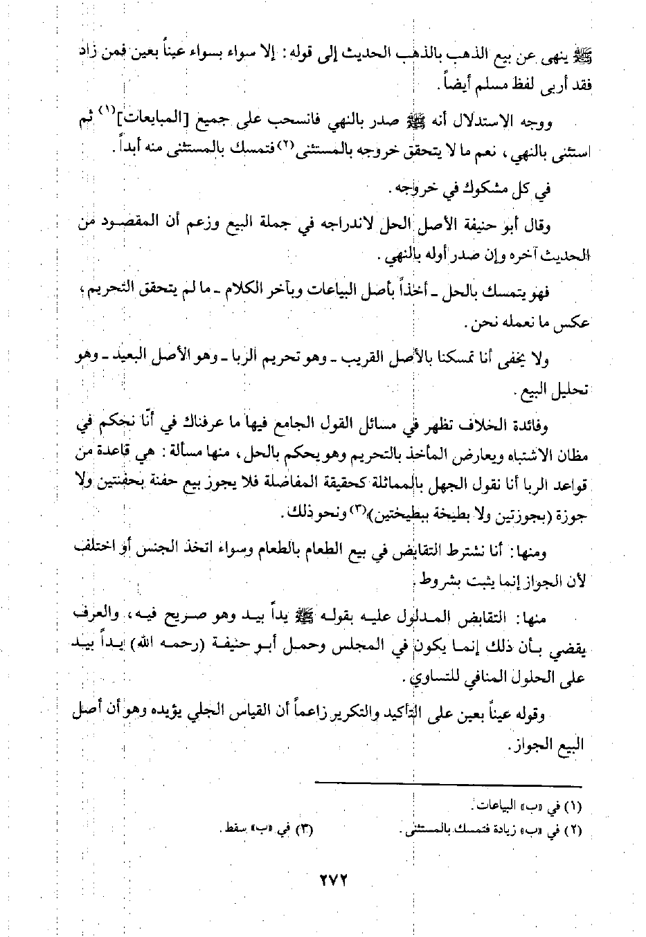 منها: التقابض المدلول عليه بقوله صلى الله عليه وسلم يدًا بيد وهو صريح فيه، والعرف يقضي بأن ذلك إنما يكون في المجلس وحمل أبو حنيفة "رحمه الله" يدًا بيد على الحلول المنافي للتساوي.