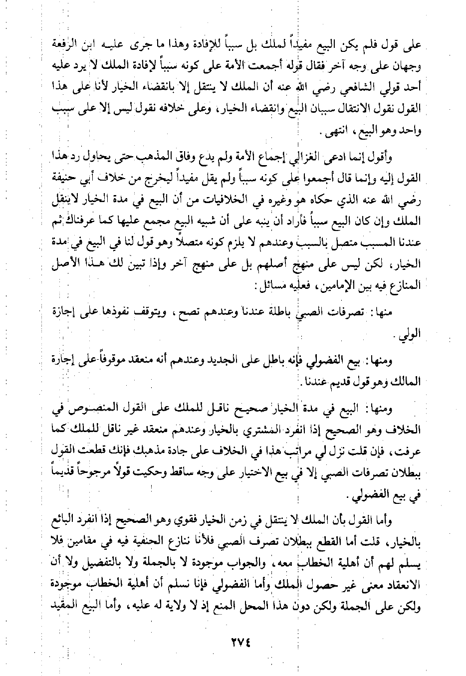 وأما القول بأن الملك لا ينتقل في زمن الخيار فقوي وهو الصحيح إذا انفرد البائع بالخيار، قلت أما القطع ببطلان تصرف الصبي فلأنا ننازع الحنفية فيه في مقامين فلا يسلم لهم أن أهلية الخطاب معه، والجواب موجودة لا بالجملة ولا بالتفضيل ولا أن الانعقاد معنى غير حصول الملك، وأما الفضولي فإنا نسلم أن أهلية الخطاب موجودة ولكن على الجملة ولكن دون هذا المحل المنع إذ لا ولاية له عليه، وأما البيع المقيد.