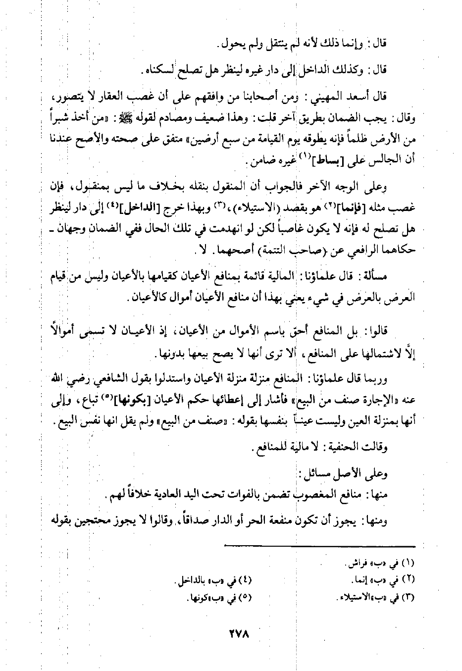 قال أسعد المهيني: ومن أصحابنا من وافقهم على أن غصب العقار لا يتصور، وقال: يجب الضمان بطريق آخر قلت: وهذا ضعيف ومصادم لقوله صلى الله عليه وسلم: "من أخذ شبرًا من الأرض ظلمًا فإنه يطوقه يوم القيامة من سبع أرضين" متفق على صحته والأصح عندنا أن الجالس على [بساط] ١ غيره ضامن.