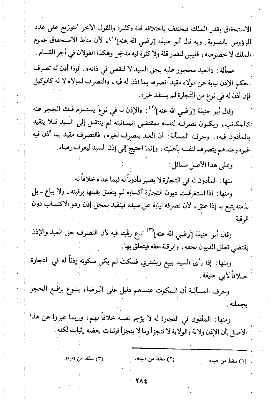 ومنها: إذا رأى السيد يبيع ويشتري فسكت لم يكن سكوته إذنًا له في التجارة خلافًا لأبي حنيفة.