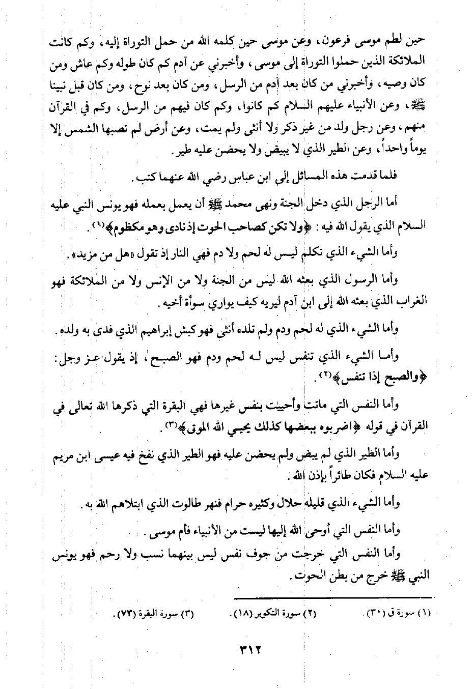 حين لطم موسى فرعون، وعن موسى حين كلمه الله من حمل التوراة إليه، وكم كانت الملائكة الذين حملوا التوراة إلى موسى، وأخبرني عن آدم كم كان طوله وكم عاش ومن كان وصيه، وأخبرني من كان بعد آدم من الرسل، ومن كان بعد نوح، ومن كان قبل نبينا صلى الله عليه وسلم، وعن الأنبياء عليهم السلام كم كانوا، وكم كان فيهم من الرسل، وكم في القرآن منهم، وعن رجل ولد من غير ذكر ولا أنثى ولم يمت، وعن أرض لم تصبها الشمس إلا يومًا واحدًا، وعن الطير الذي لا يبيض ولا يحضن عليه طير.