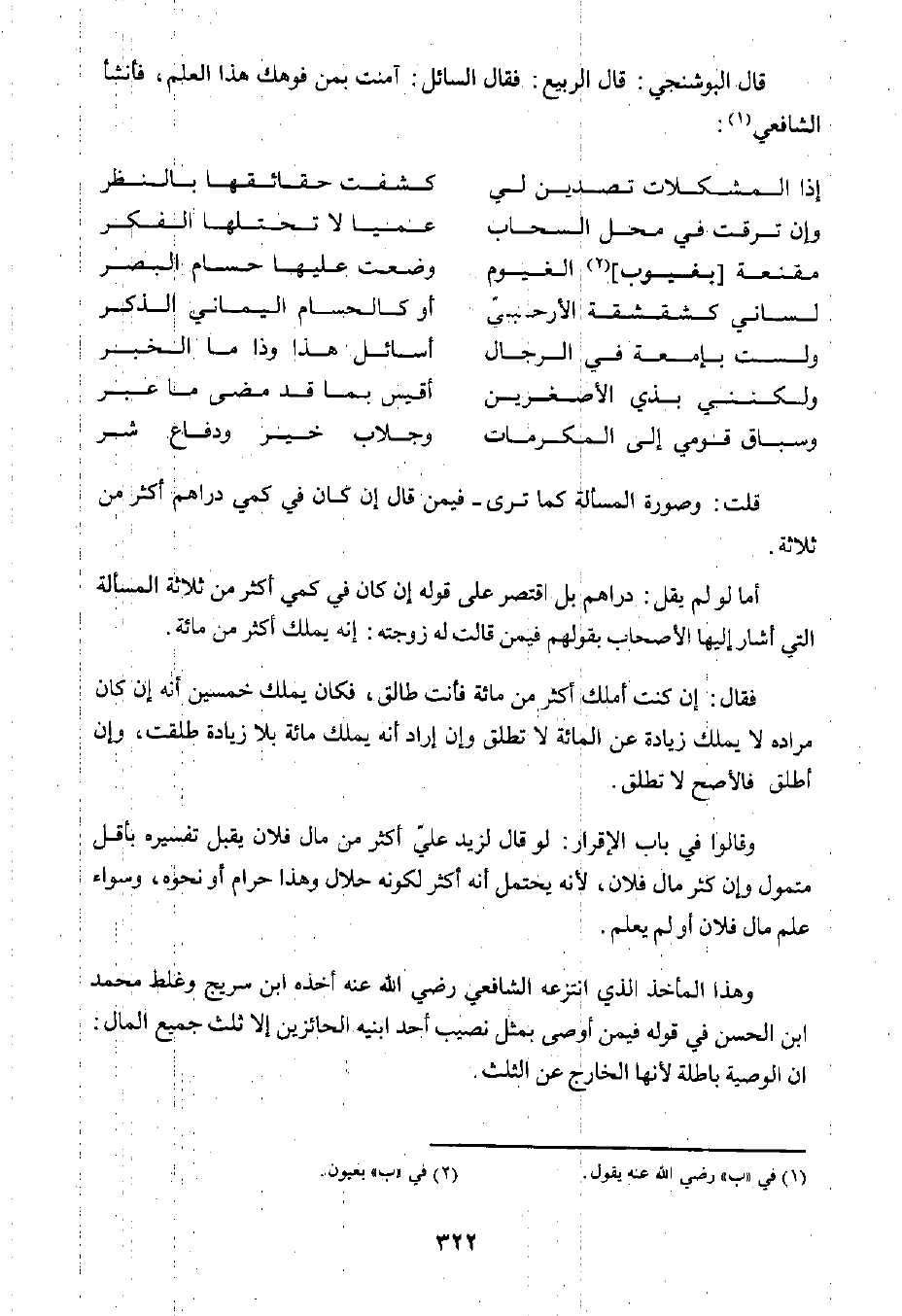 قال البوشنجي: قال الربيع: فقال السائل: آمنت بمن فوهك هذا العلم؛ فأنشأ الشافعي١: