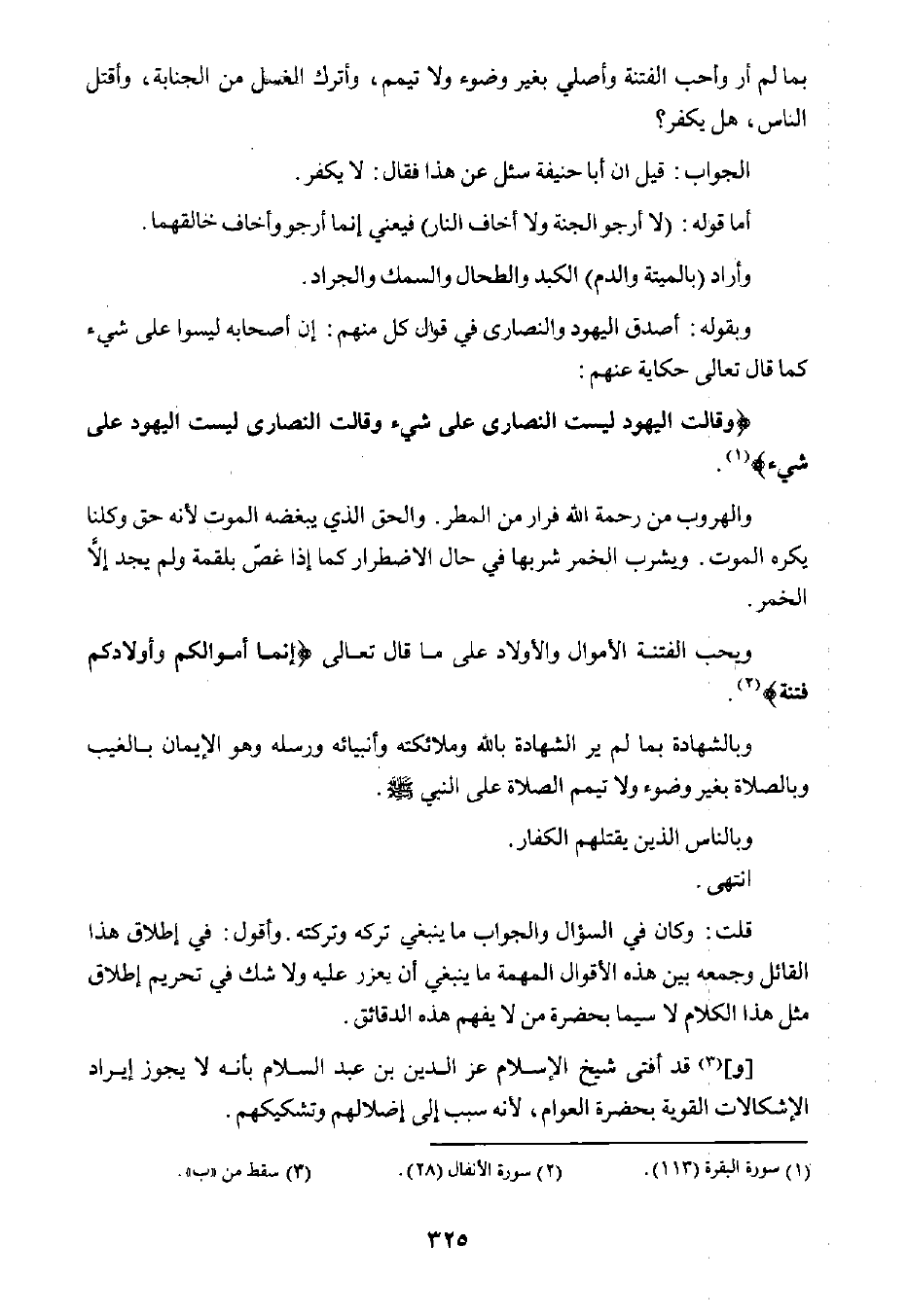 [و] ٣ قد أفتى شيخ الإسلام عز الدين بن عبد السلام بأنه لا يجوز إيراد الإشكالات القوية بحضرة العوام، لأنه سبب إلى إضلالهم وتشكيكهم.
