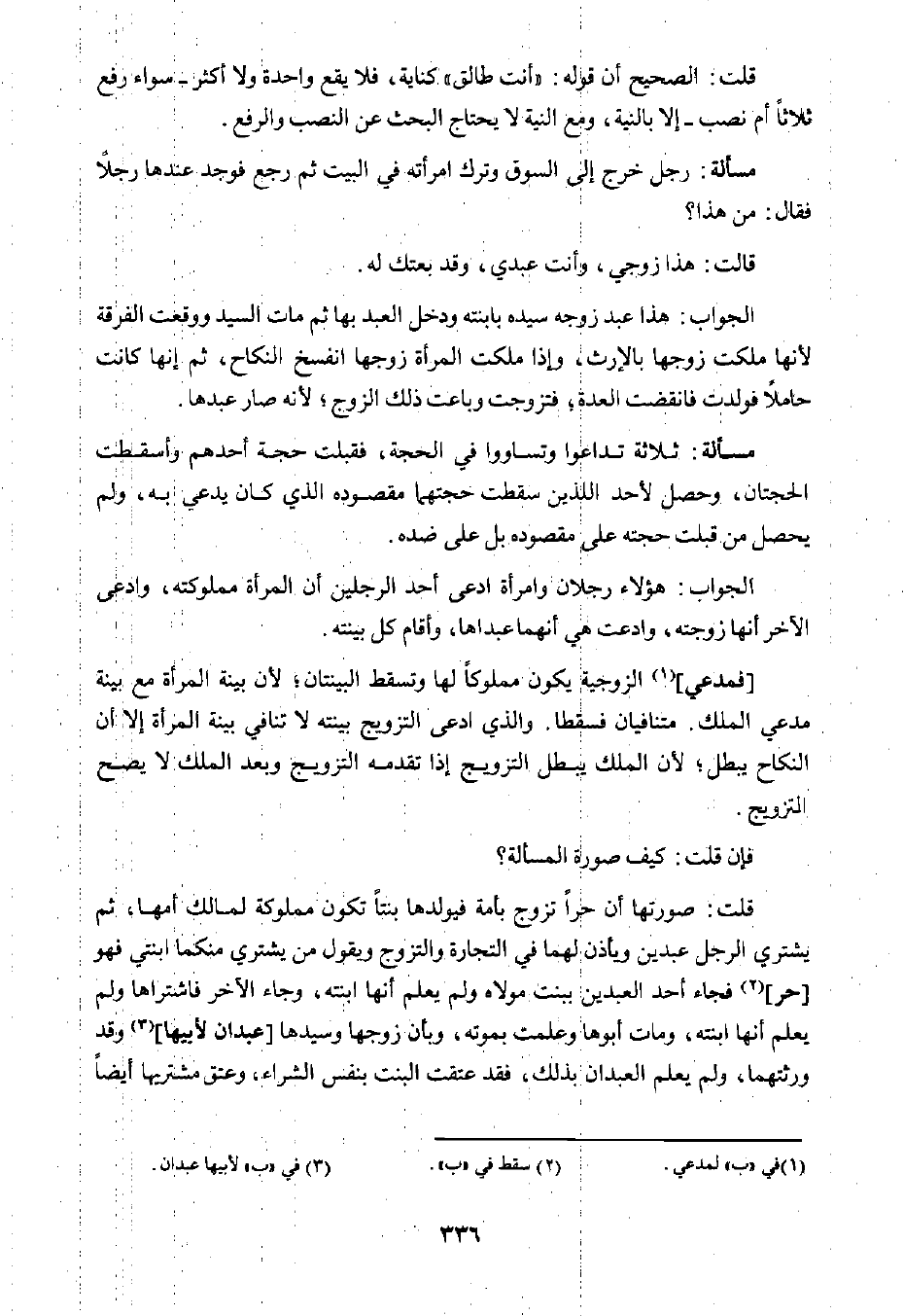 الجواب: هؤلاء رجلان وامرأة ادعى أحد الرجلين أن المرأة مملوكته، وادعى الآخر أنها زوجته، وادعت هي أنهما عبداها، وأقام كل ببينته.