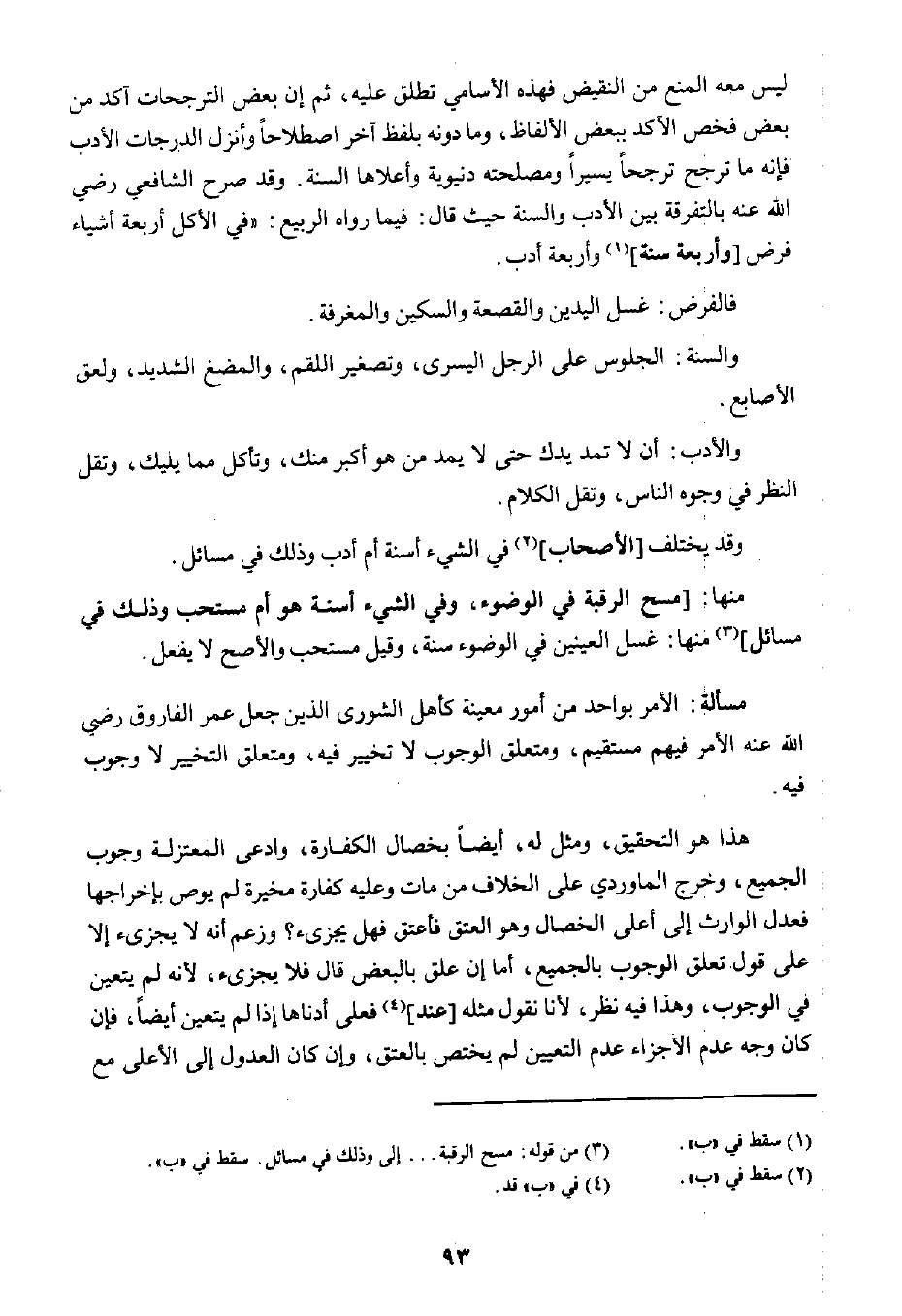 منها: [مسح الرقبة في الوضوء، وفي الشيء أسنة هو أم مستحب وذلك في مسائل] ٣ منها: غسل العينين في الوضوء سنةن وقبل مستحب والأصح لا يفعل.